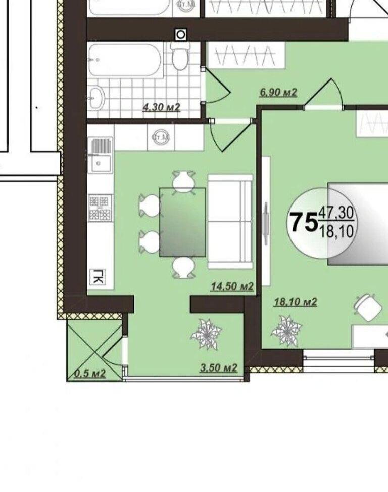 Предлагаем купить 1-комнатную квартиру в новостройке ЖК "Добробуд" площадью 47,60 м² без внутренних работ.