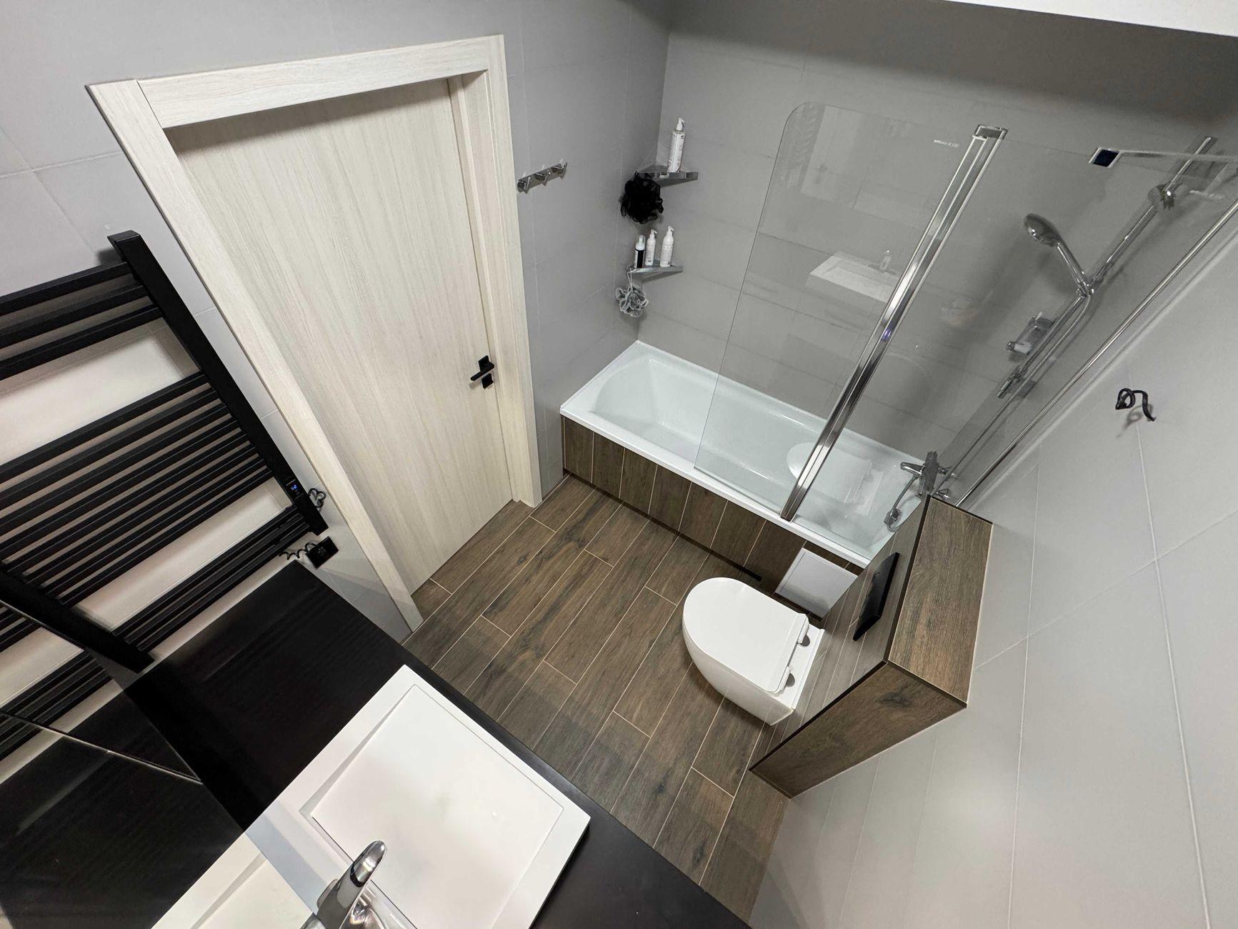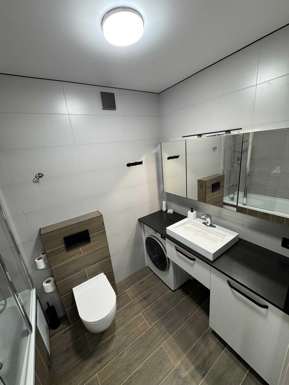 Ванна: ванна Ravak 180×80, душ с терморегулятором, тумба и раковина из керамогранита, сенсорный кран, стиральная машина LG, полотенцесушитель, зеркальный шкафчик с подсветкой.