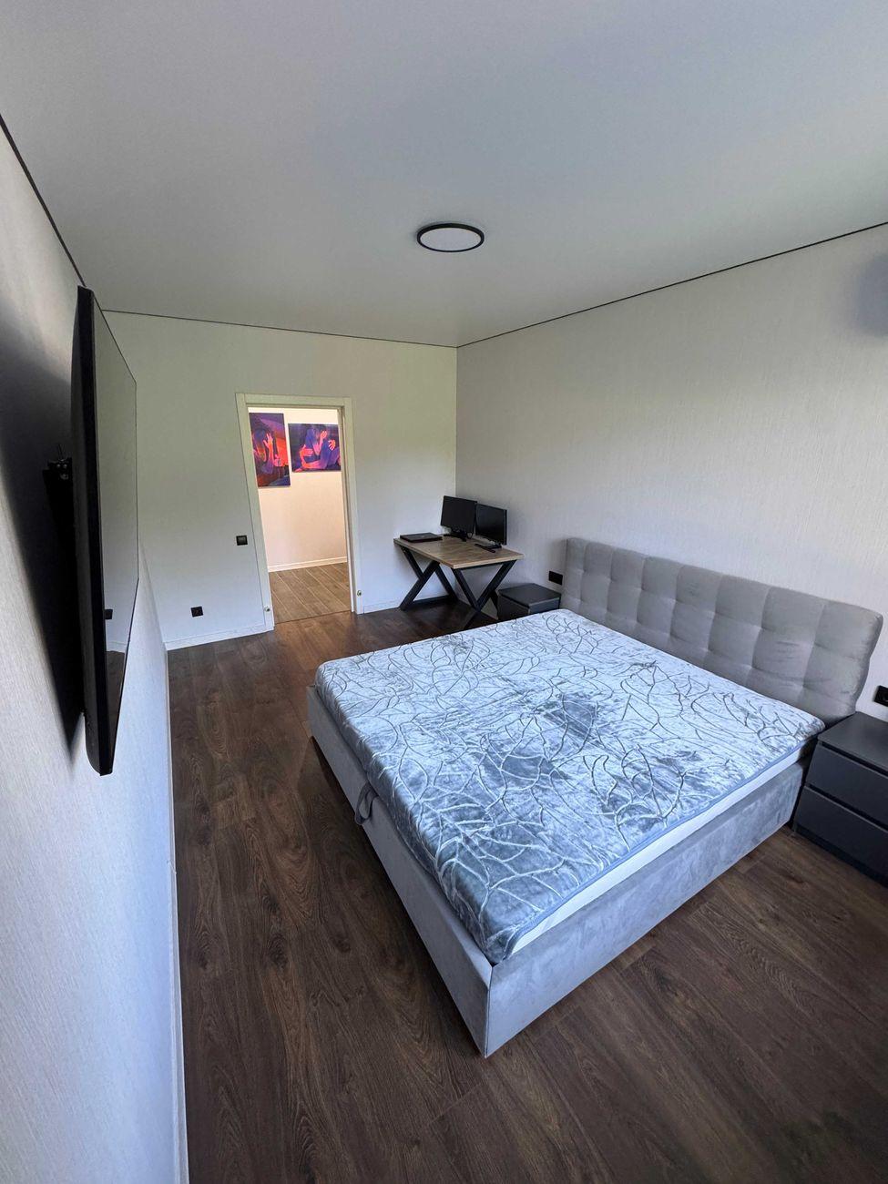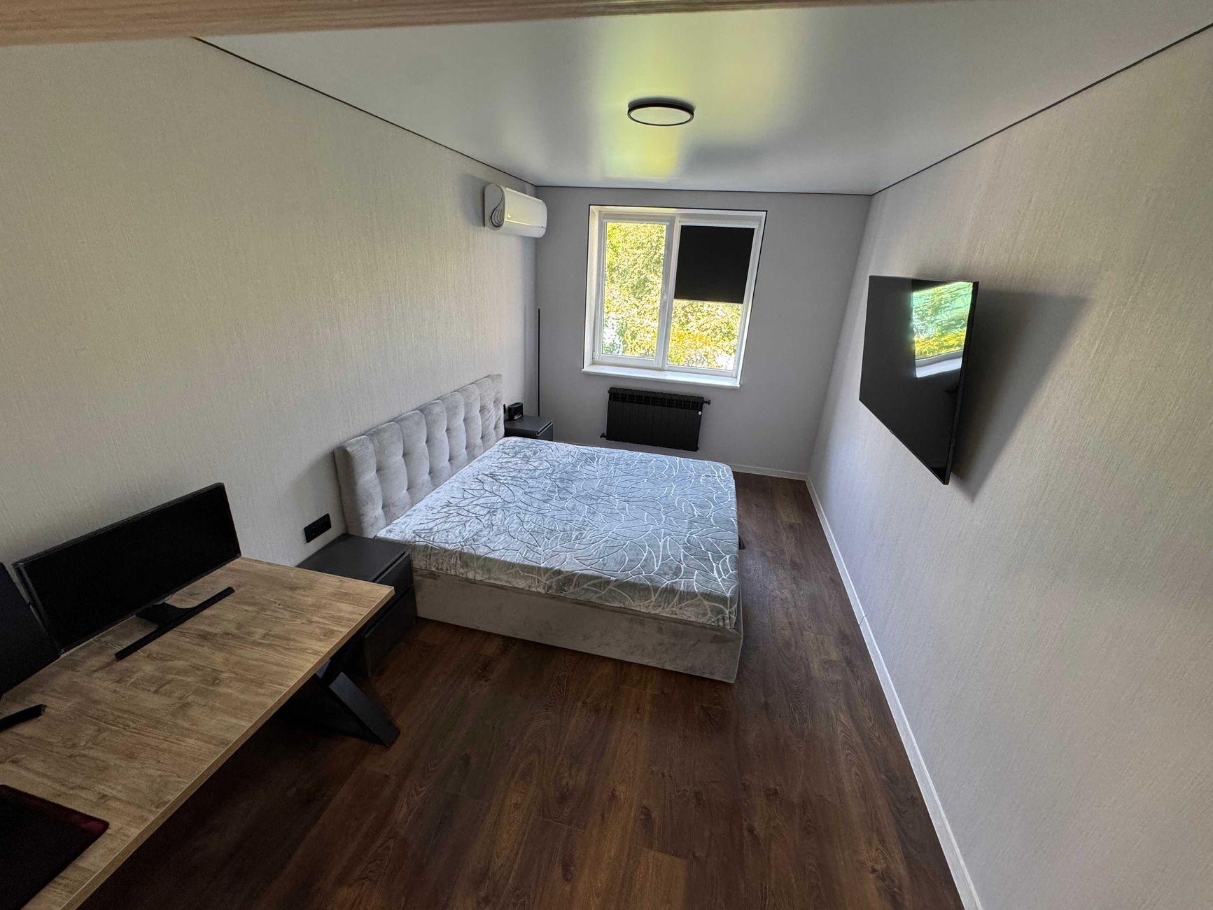 Комната 2: кровать 180×200 см, большой телевизор напротив, черные Blackout роллеты для полного затемнения, свет с регулировкой температуры и яркости, кондиционер.