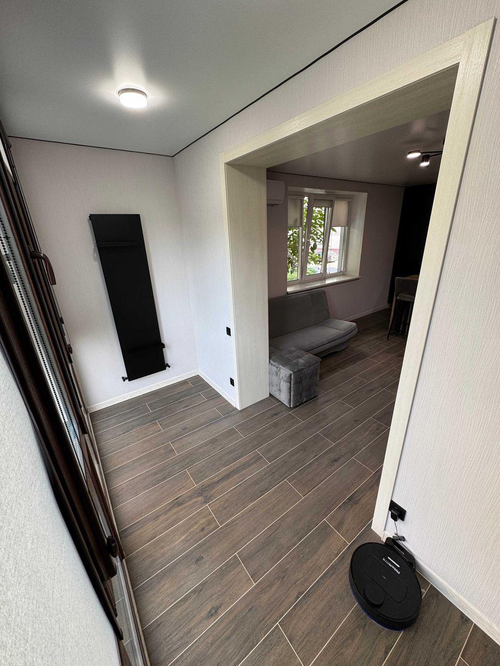 Дверь и коридор: стильная бронированная дверь Straj с усиленными противовзломными элементами. Просторный коридор, во всех комнатах – черные дизайнерские батареи и кондиционеры с функцией обогрева и охлаждения.