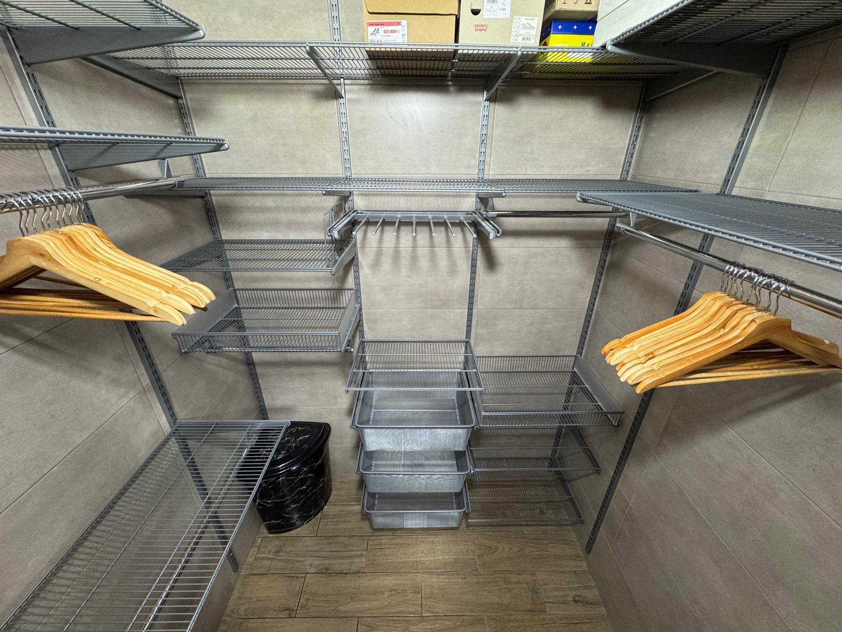 Гардеробная: индивидуальная система хранения от Combina, скрытая верхняя полка, розетка для техники.