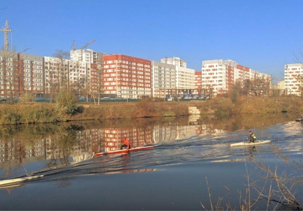 Недалеко от зеленой зоны и реки.