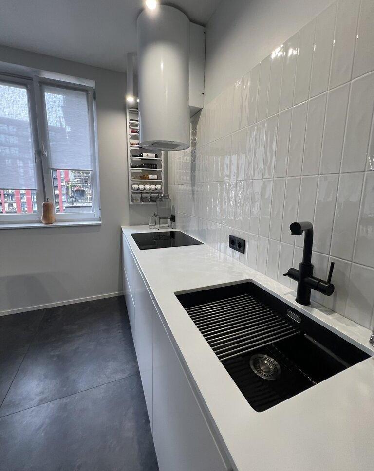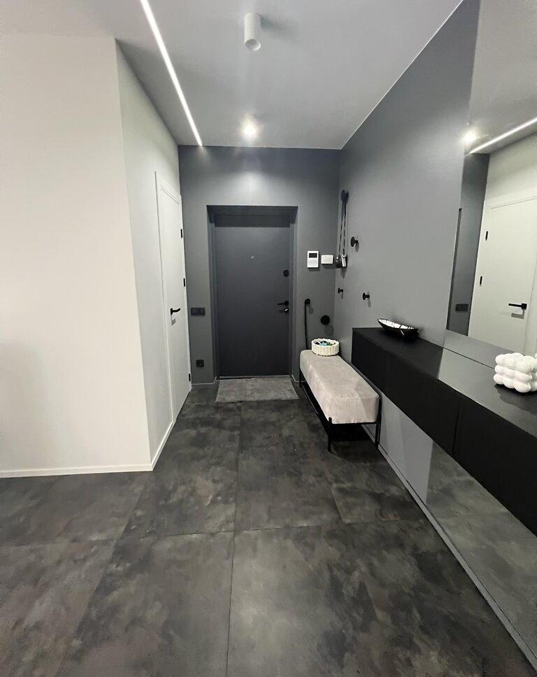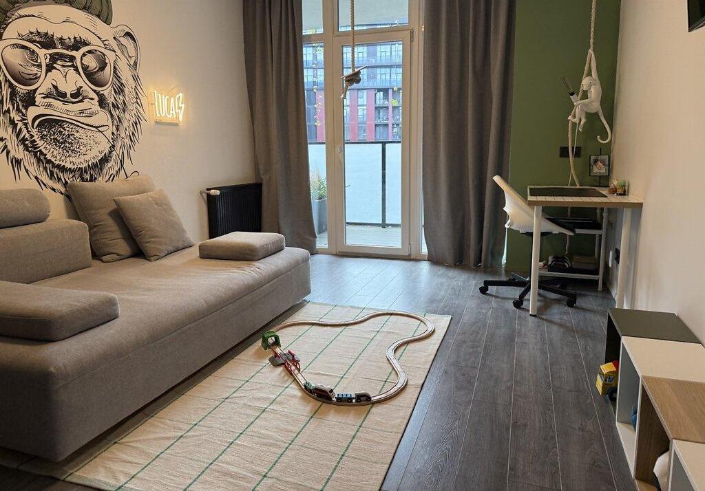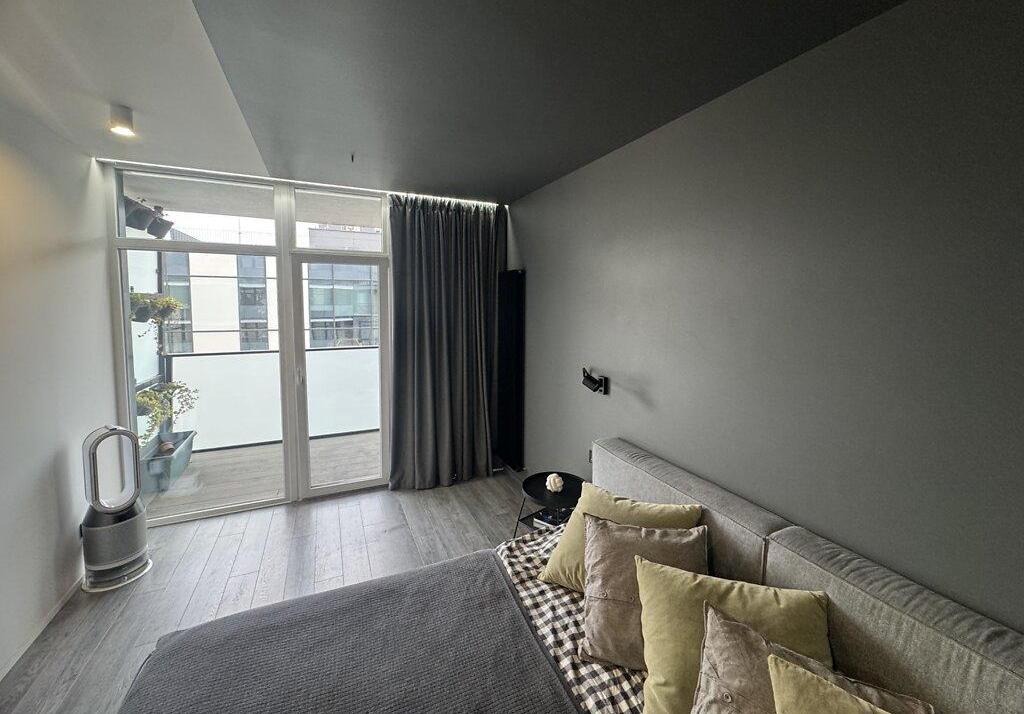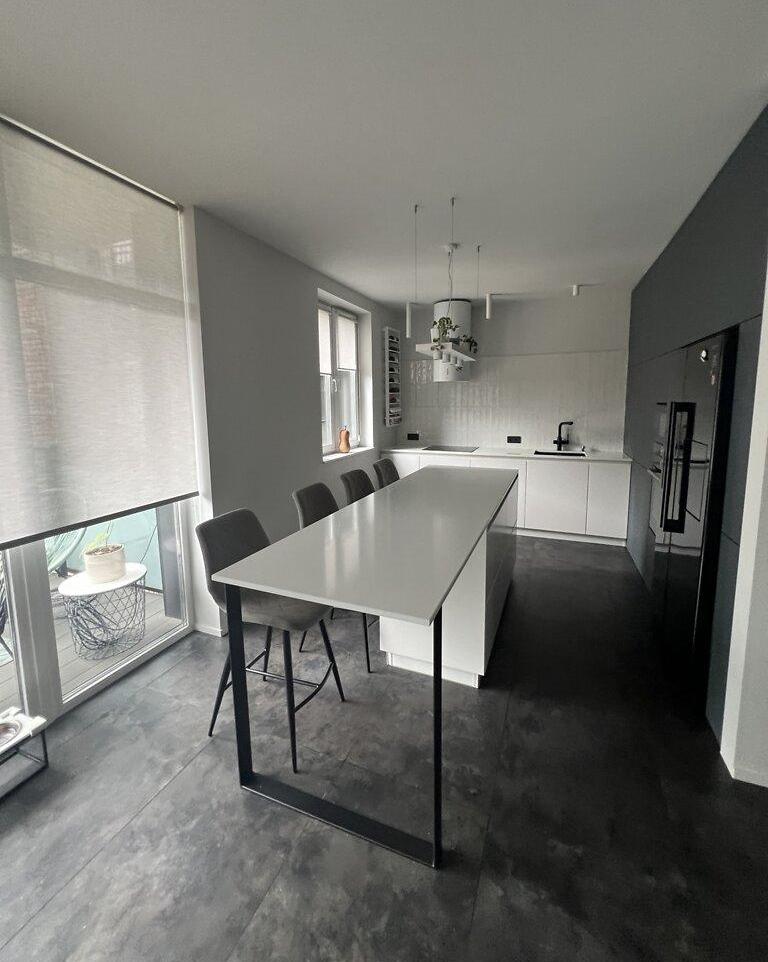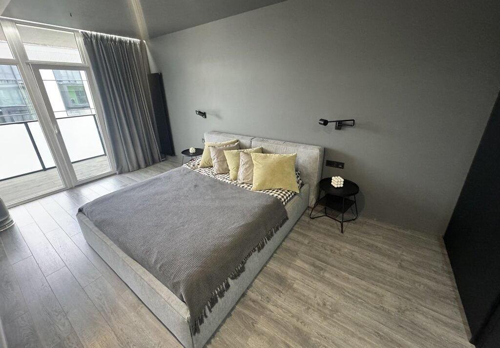 Современная квартира с дизайнерским ремонтом, просторная кухня-студия 55 м², спальня, детская комната, санузел душ+ванная, техническое помещение-прачечная. Из кухни-гостиной и детской есть выход на просторную террасу, окна выходят во двор. Из спальни выход на балкон с видом на Высокий замок.