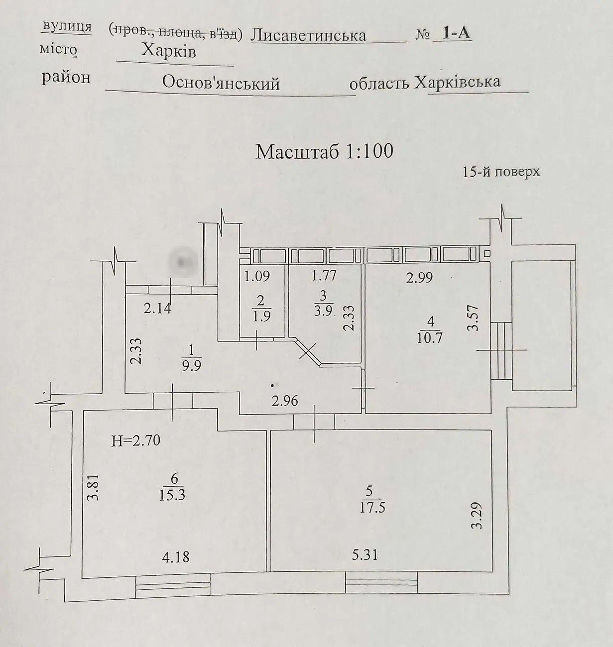 Квартира находится на 15 этаже 16-этажного кирпичного дома. Общая площадь – 61 м², кухня 10,7 м² с выходом на остекленную лоджию.