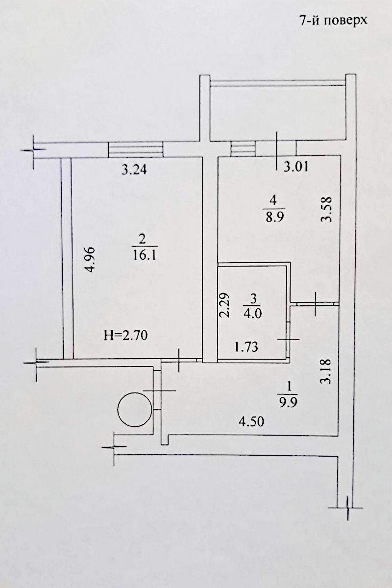 Кирпичный дом, этаж – 7/9, общ. площадь – 41 м²., жилая – 16 м²., кухня – 9 м².