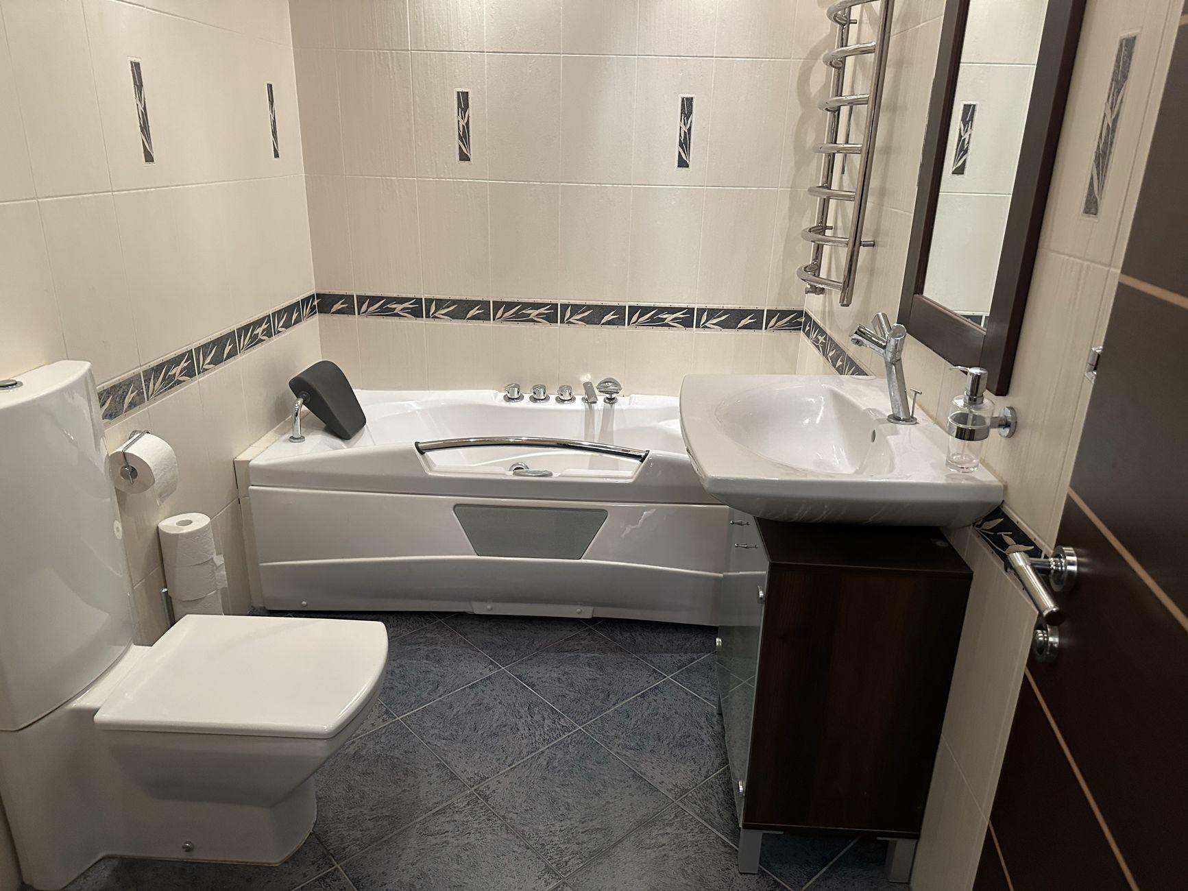 В квартире выполнен дизайнерский ремонт с использованием качественных европейских материалов. Отопление централизовано с личным учетом по счетчику. Дополнительно установлен резервный бак для воды и насос. На вводе воды смонтирована система фильтрации, на кухне отдельный фильтр для питьевой воды. Горячее водоснабжение централизовано, дополнительно установлен бойлер.