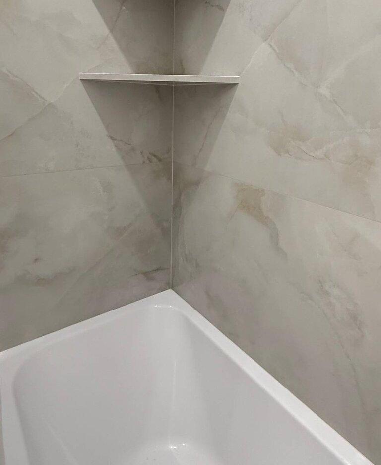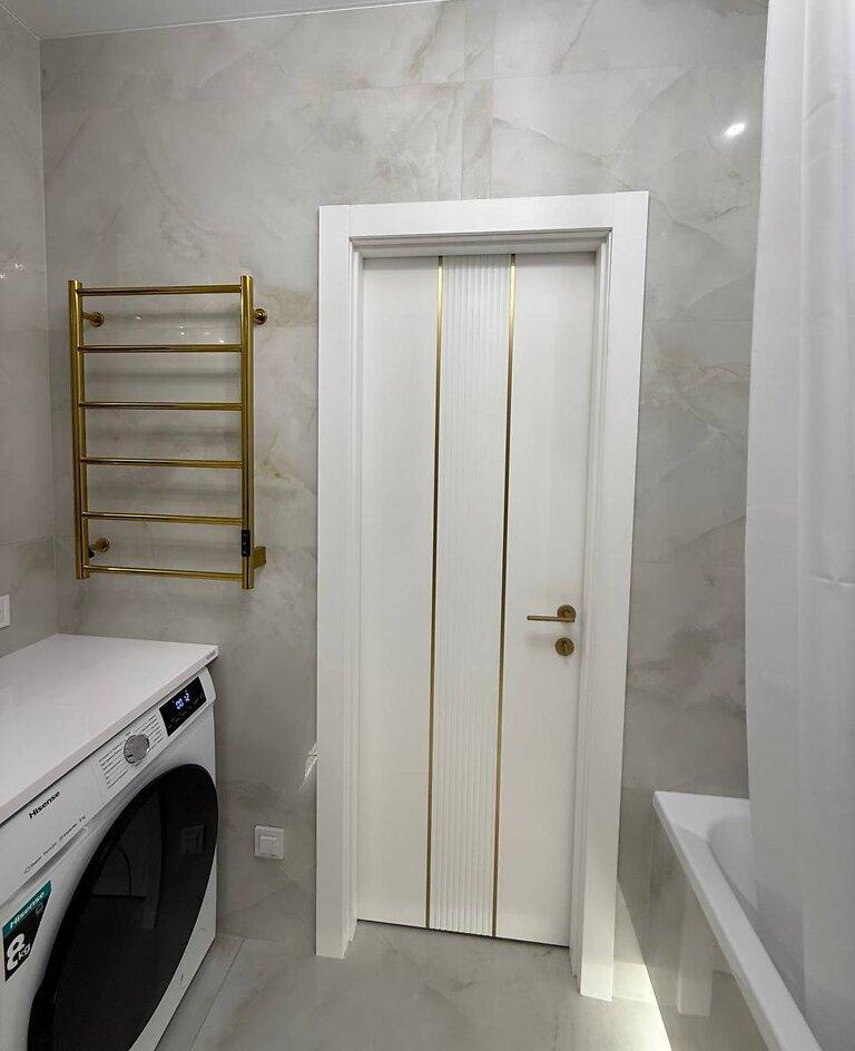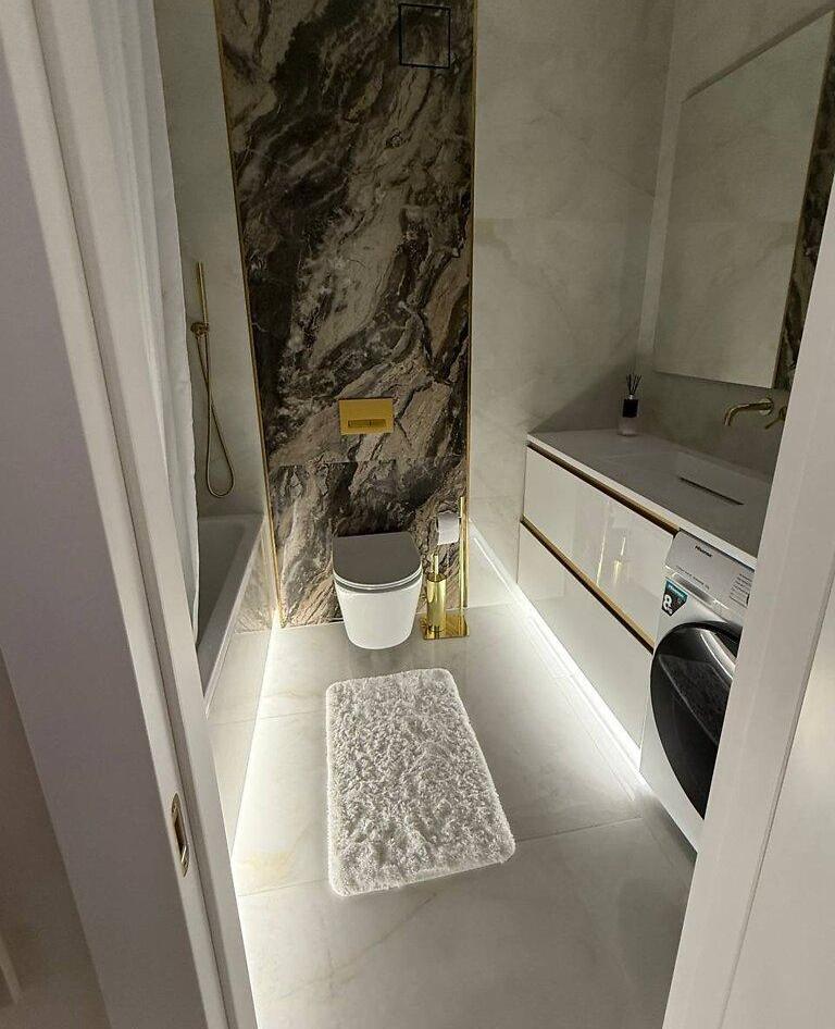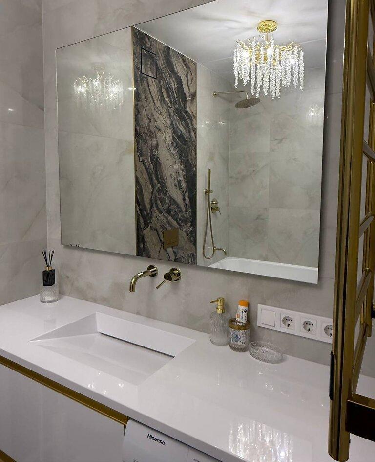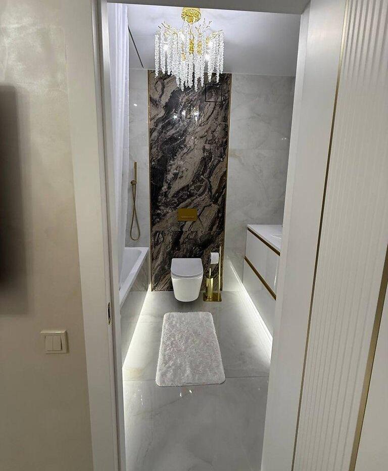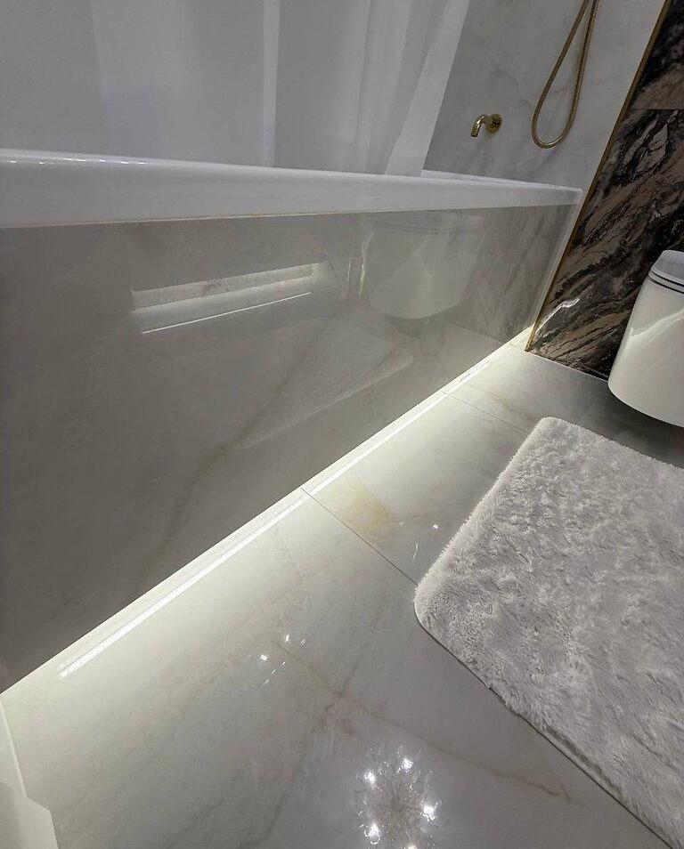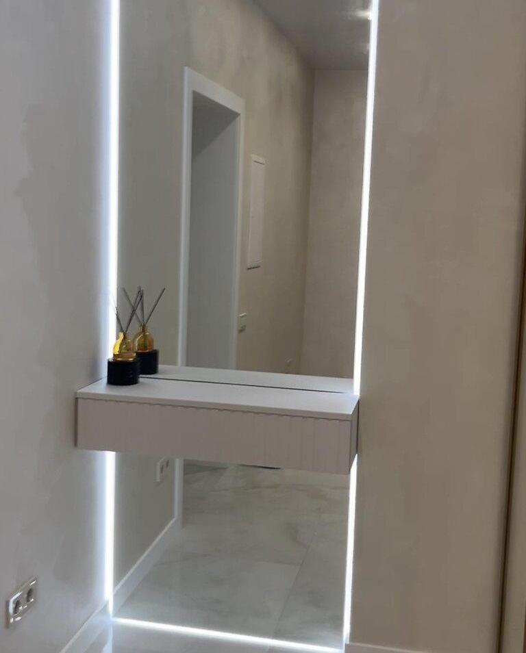 Лед подсветки в спальне и ванной, карнизы скрытого монтажа.