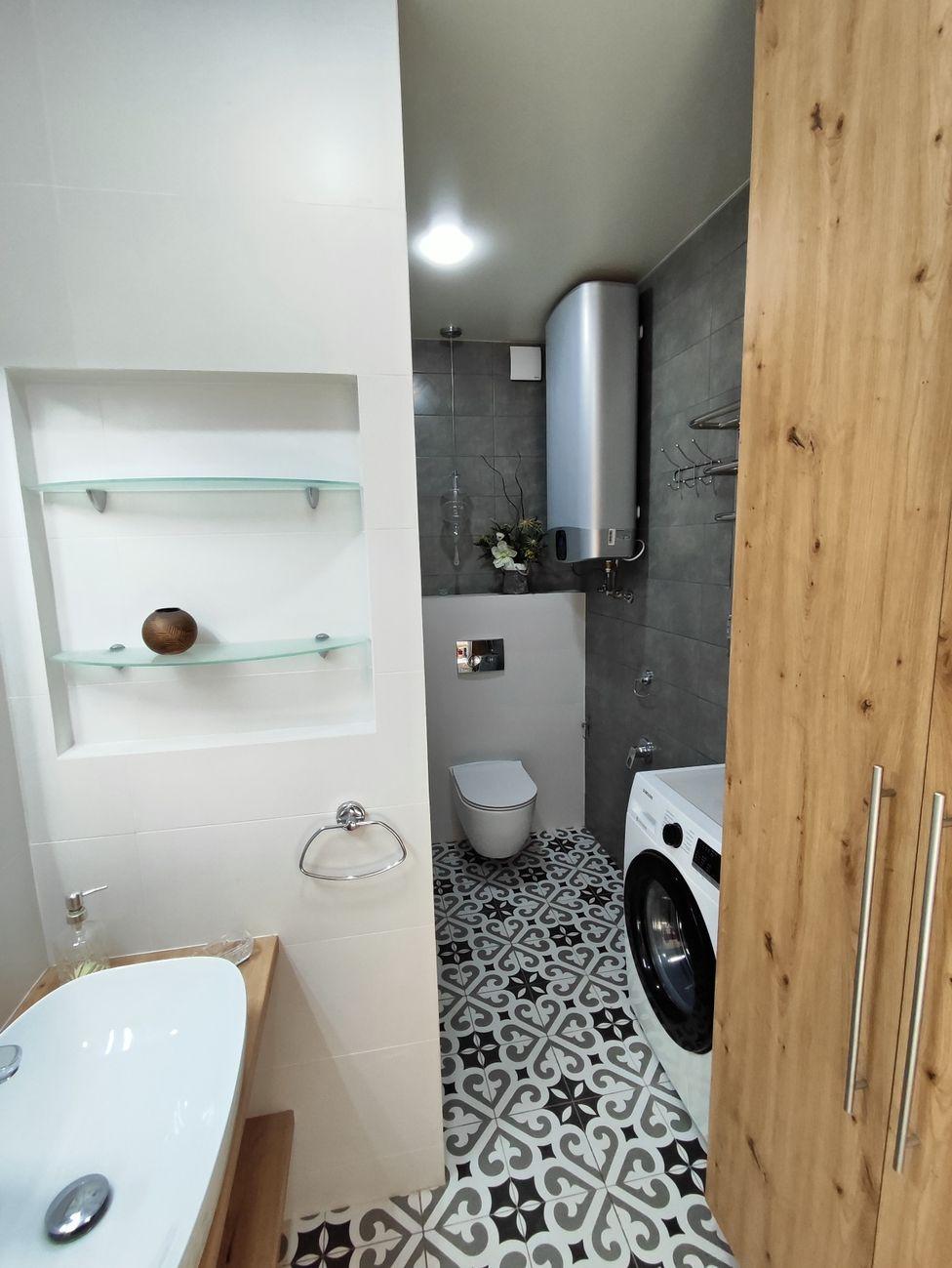 Вся сантехника Grohe,Hansgrohe(Германия)инсталяция GEBERIT (Германия) керамическая раковина Италия),акриловая ванная(Австрия), установлены радиаторы биметал скрытого монтажа.