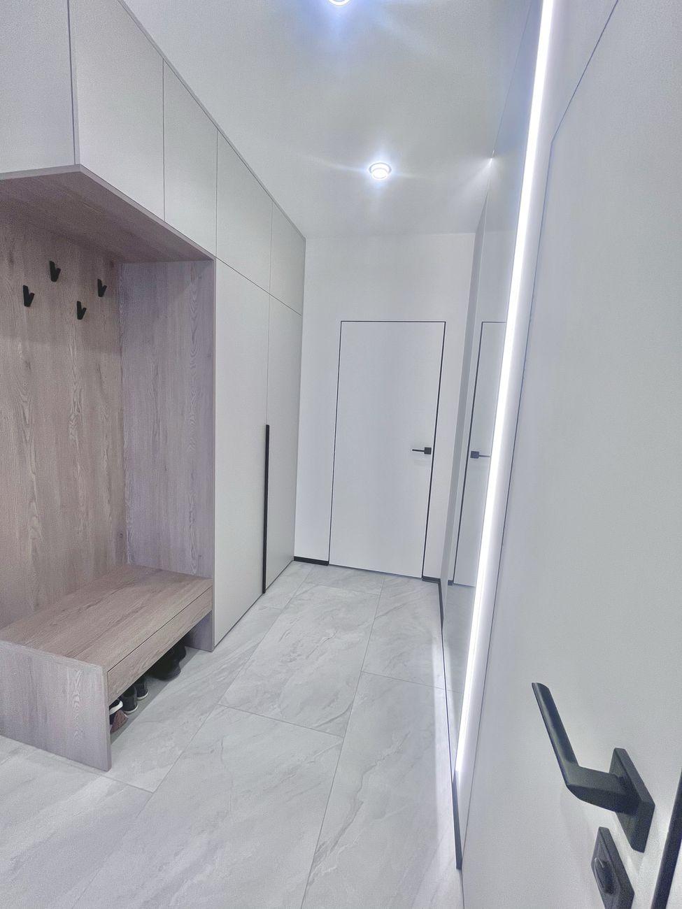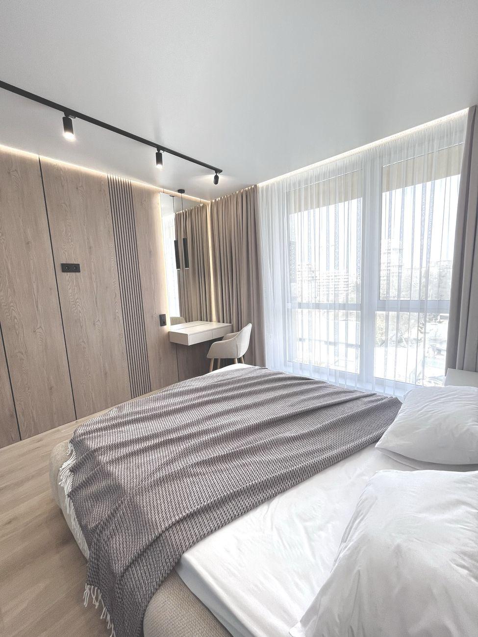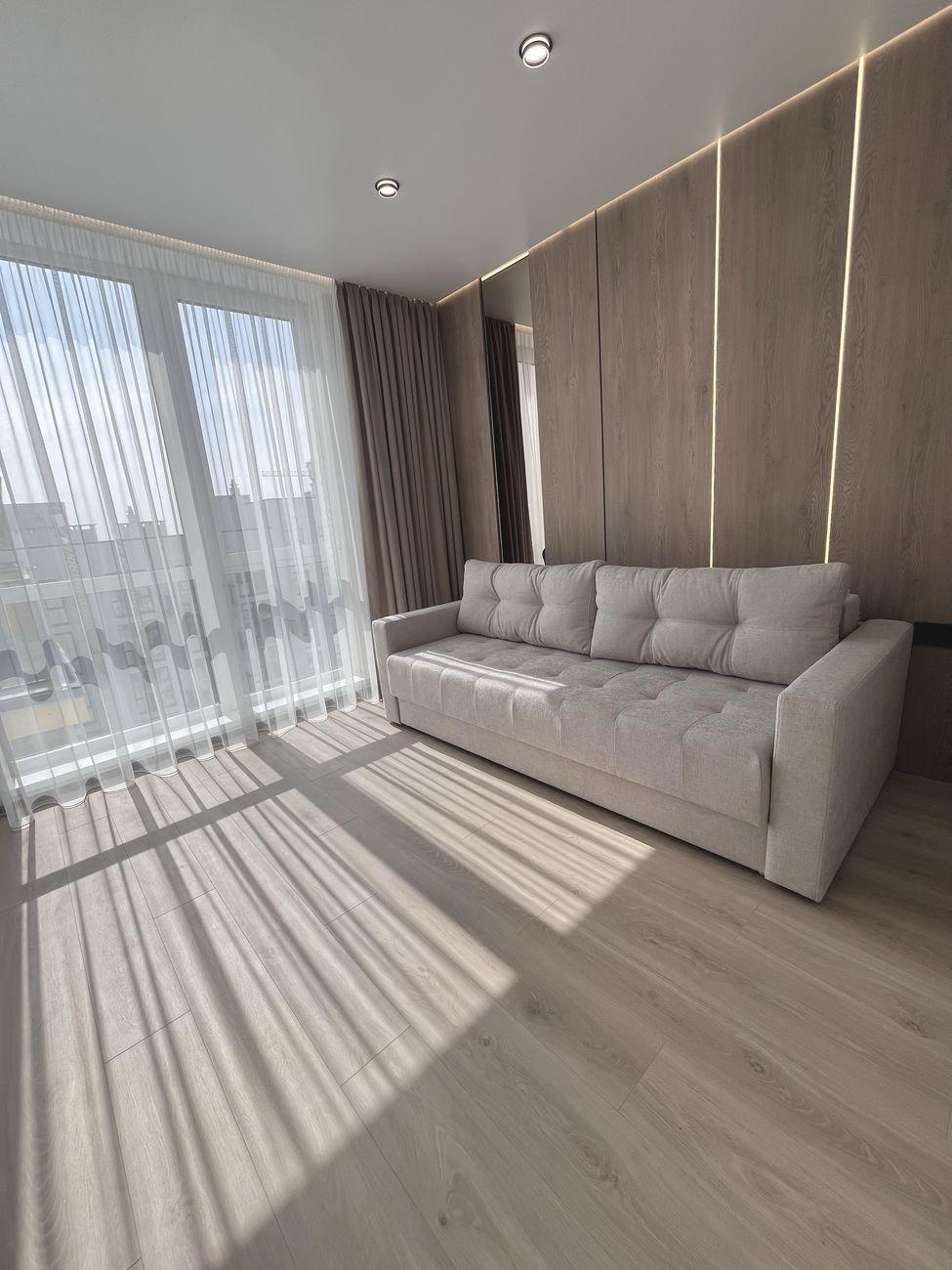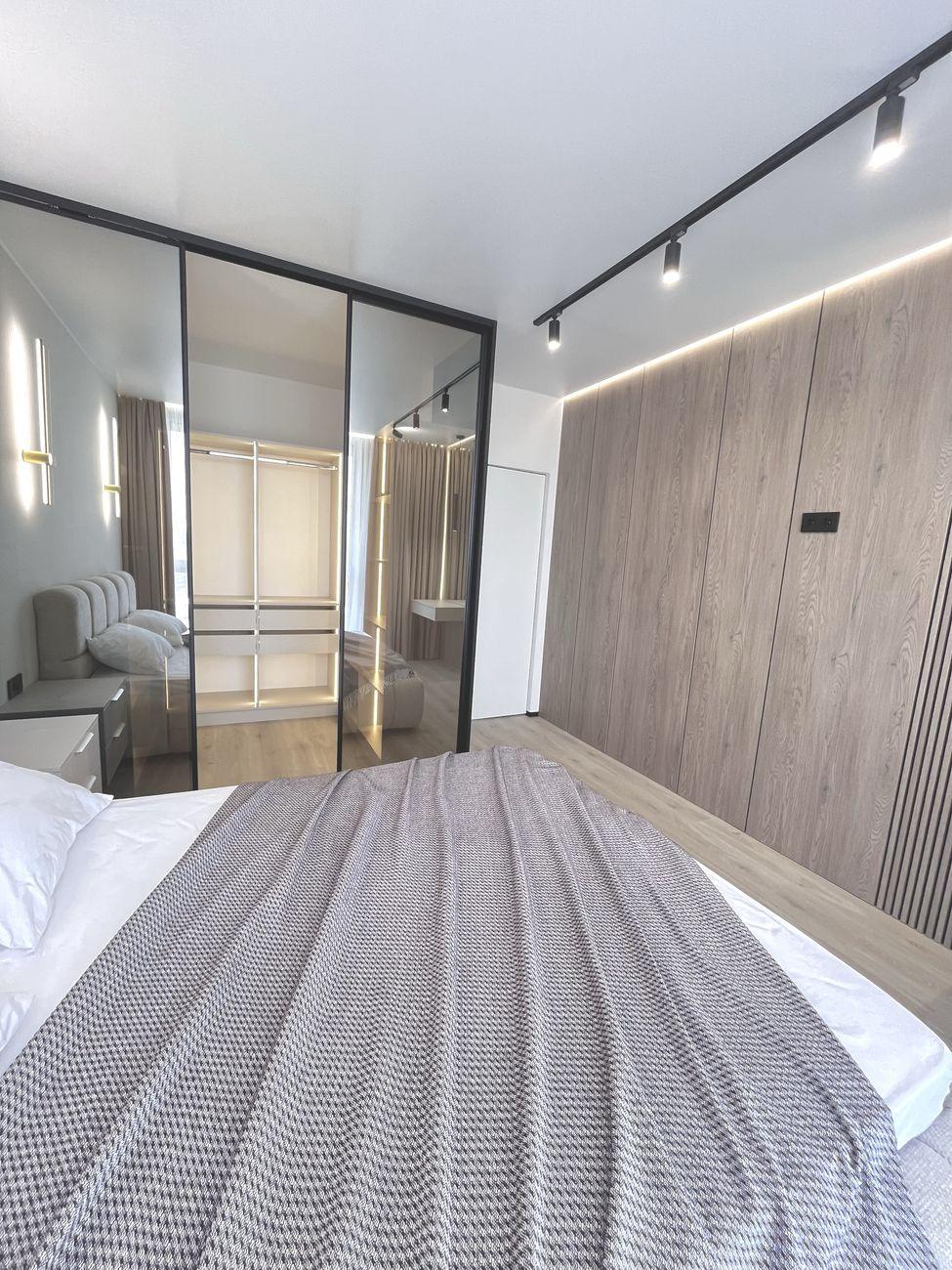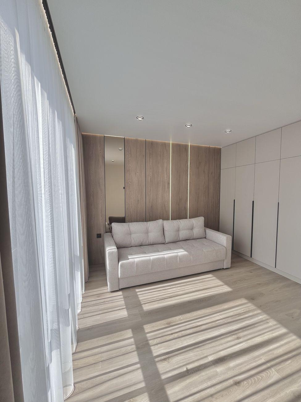 Удобная планировка: просторная кухня-гостиная, две комнаты, большая вместительная гардеробная. В спальне – кровать с подъемным механизмом, в гостиной – раскладной диван.
