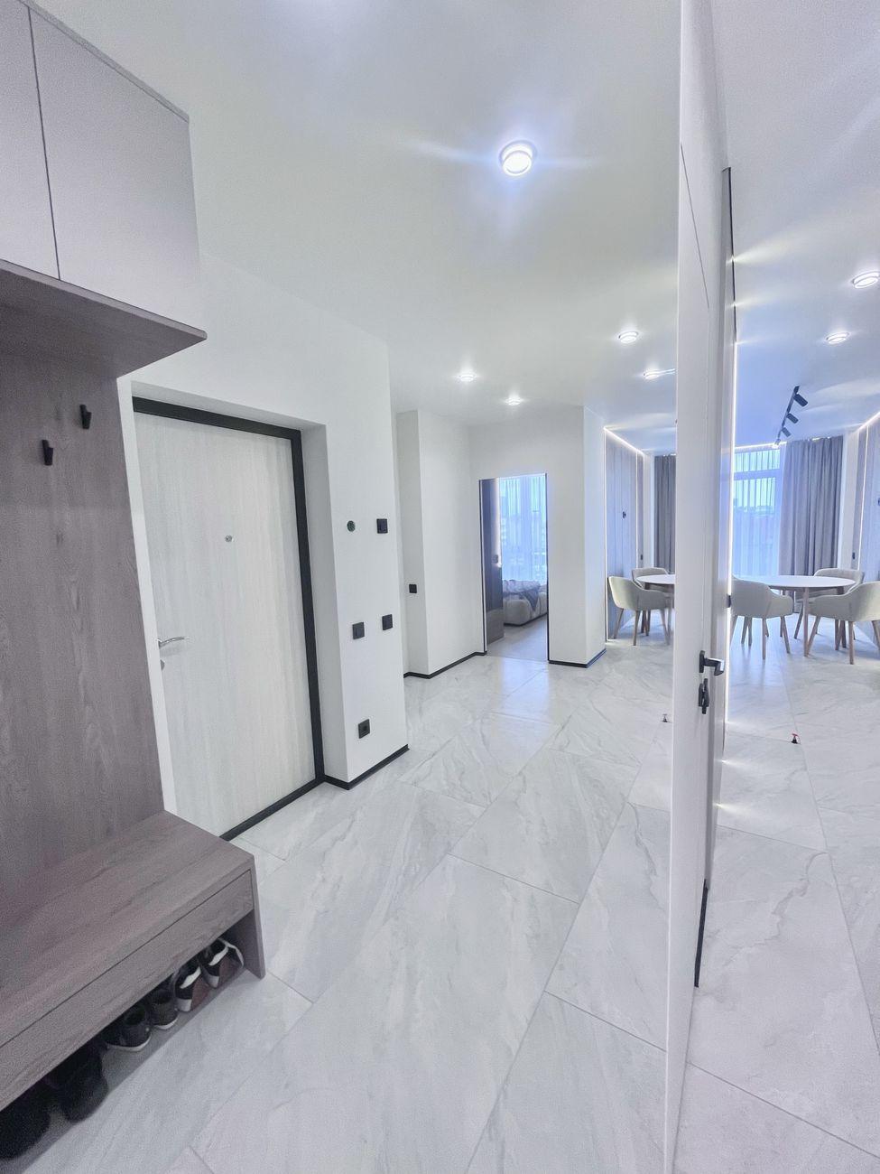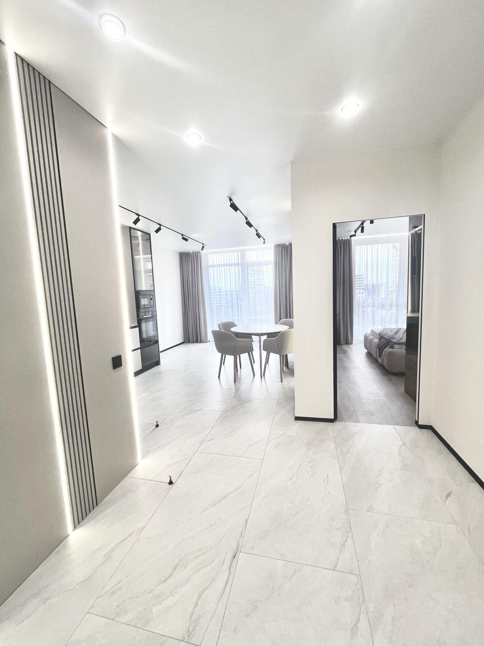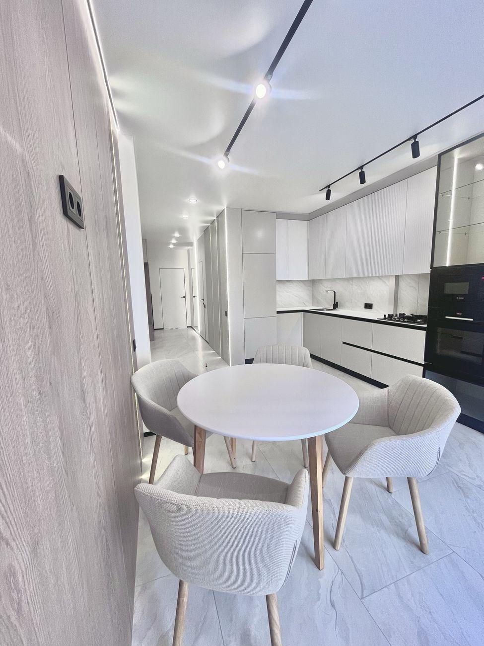 Квартира светлая и просторная, с современным стильным дизайном, качественным ремонтом и новой встроенной техникой. Оснащенная техникой Bosch, установлен телевизор Samsung, есть стирально-сушильная машина. Теплый электрический пол установлен повсюду, где есть плитка.