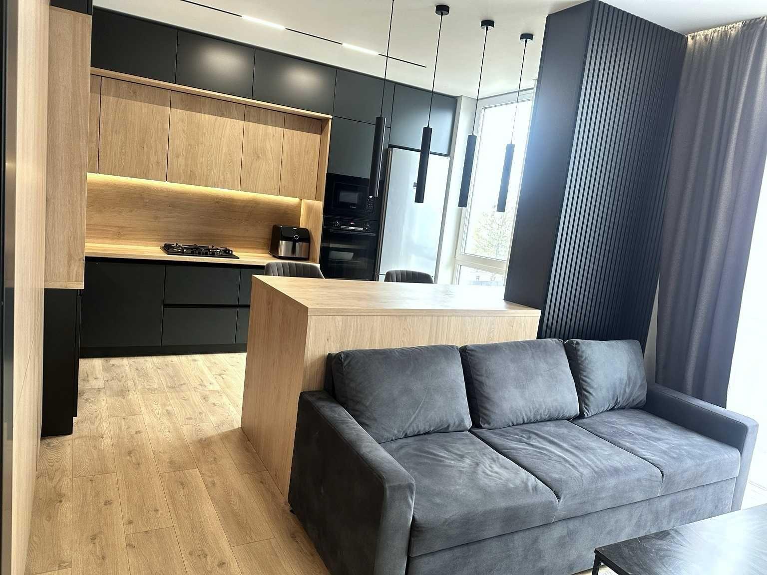 Полностью украшена и меблирована. Дизайнерский ремонт: темная кухня с матовыми фасадами и рельсовыми деревянными панелями, большая кухня-гостиная 22, 4 м² с панорамным остеклением. Ванная комната крупноформатная плитка под мрамор, ванна, подогрев полотенец. Спальня 13 м², мраморная стена-изголовье, подвесные светильники. Встроенная гардеробная со стеллажами и подсветкой в коридоре (7, 9 м2).