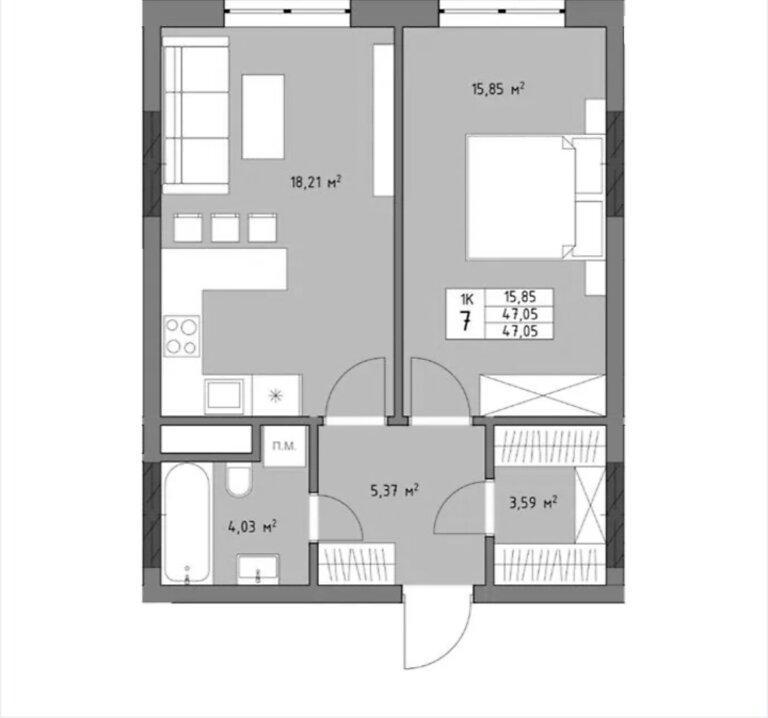 1 комн. · 10/12 эт. · 47.05/15.85/18.21 м²