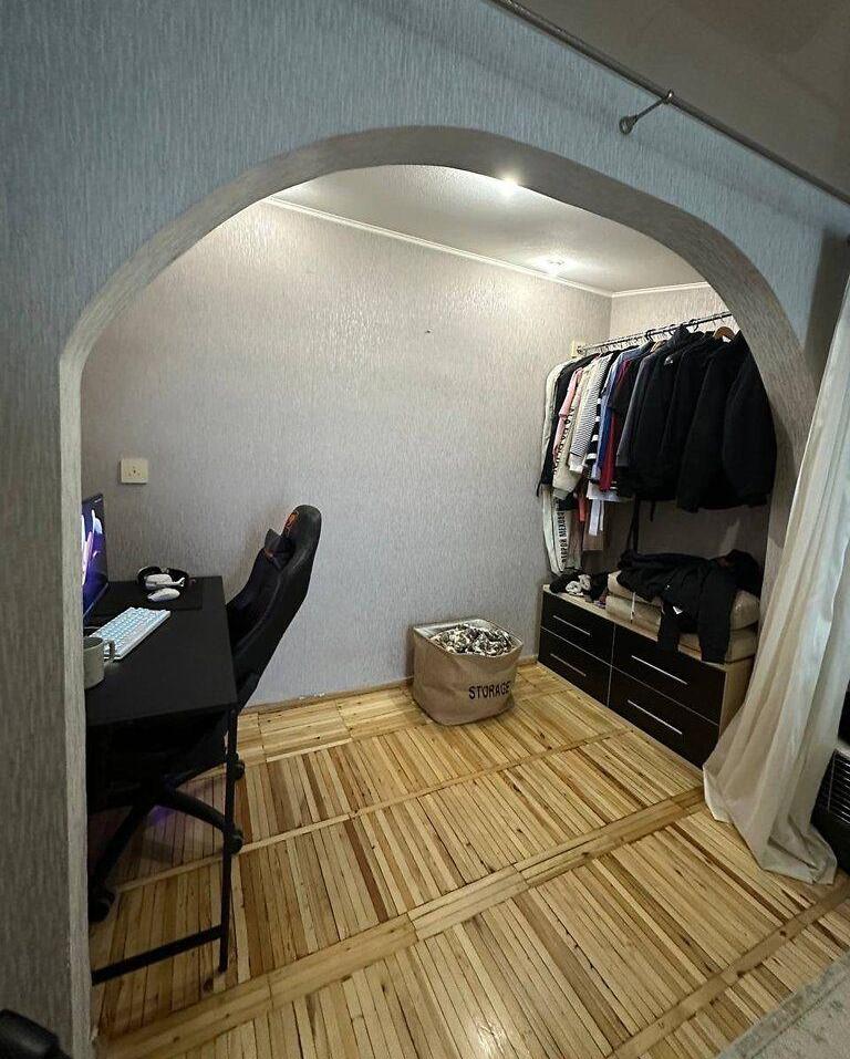 Квартира находится на 9 этаже 9-этажного дома. Планировка квартиры – нестандартная, площадь жилой комнаты 32 м², площадь кухни 8 м².