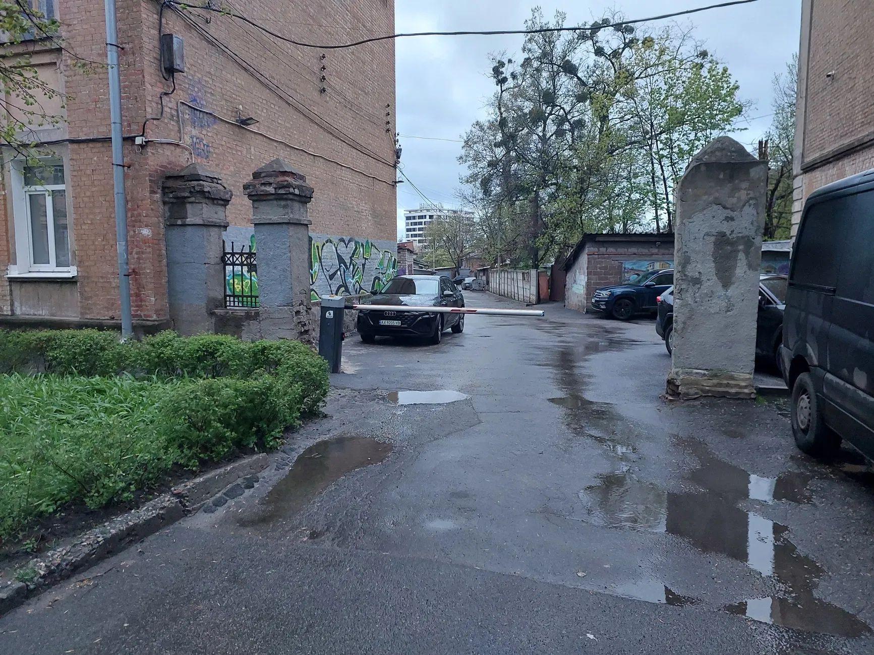 Подвір'я закрите, на в'їзді шлагбаум.