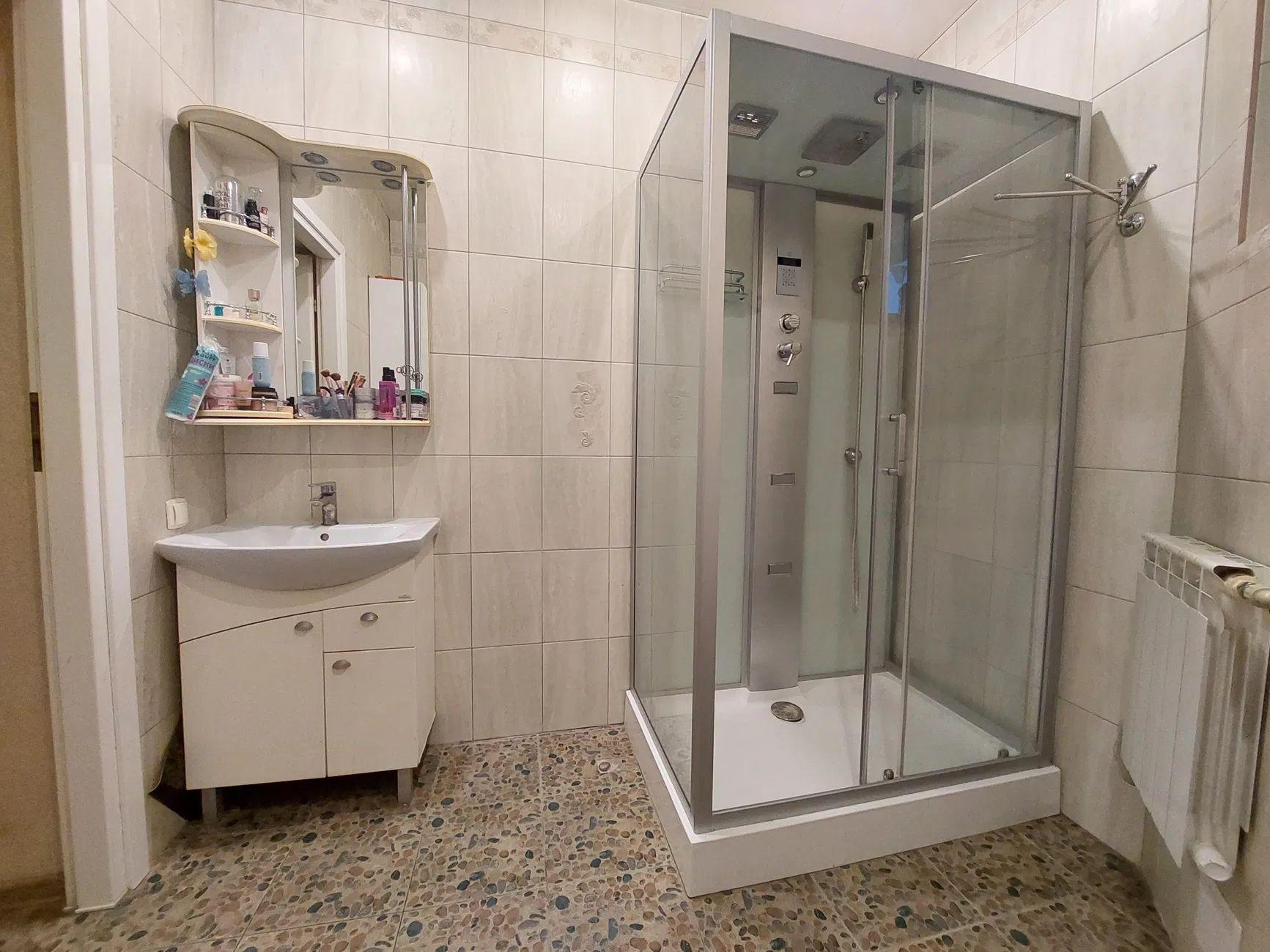 Санвузол з двома віконками, з батареєю, підлога керамограніт, велика Італійська душова кабіна з масажним душем, з підсвічуванням, з витяжкою, з радіо, з wi-fi.