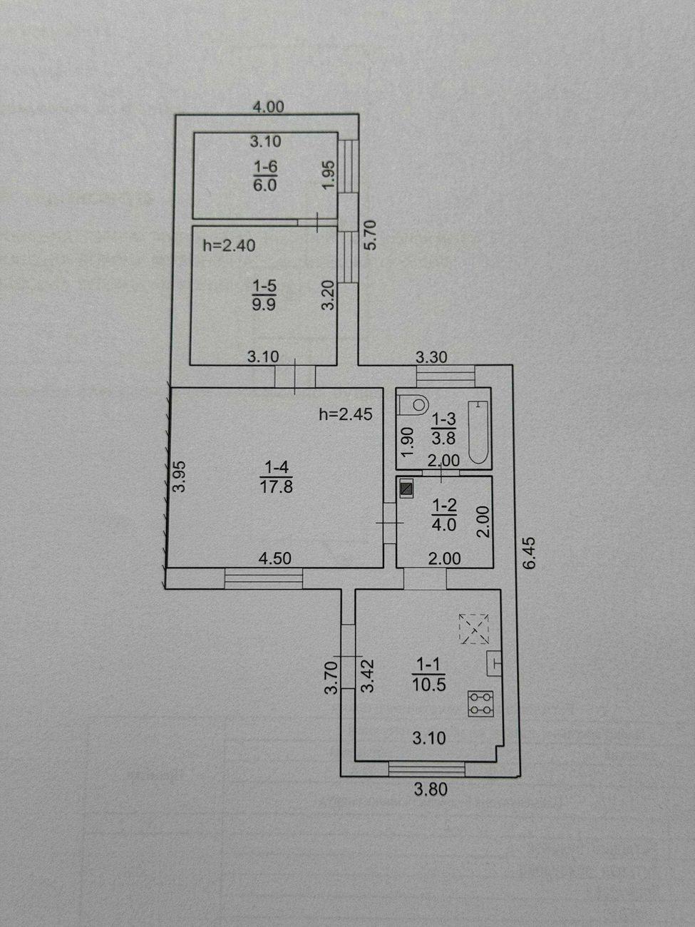 Общая площадь дома 52 кв.м: кухня 10.5; 3 комнаты 17.8; 9.9; 6.0, коридор 4.0, ванная 3.8.