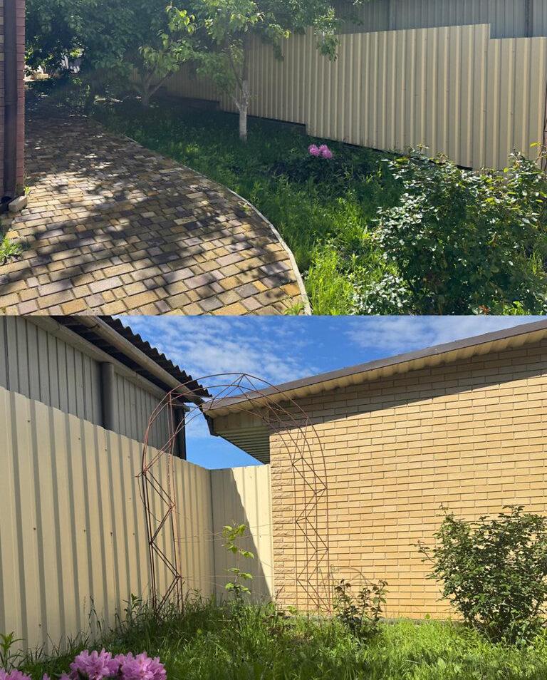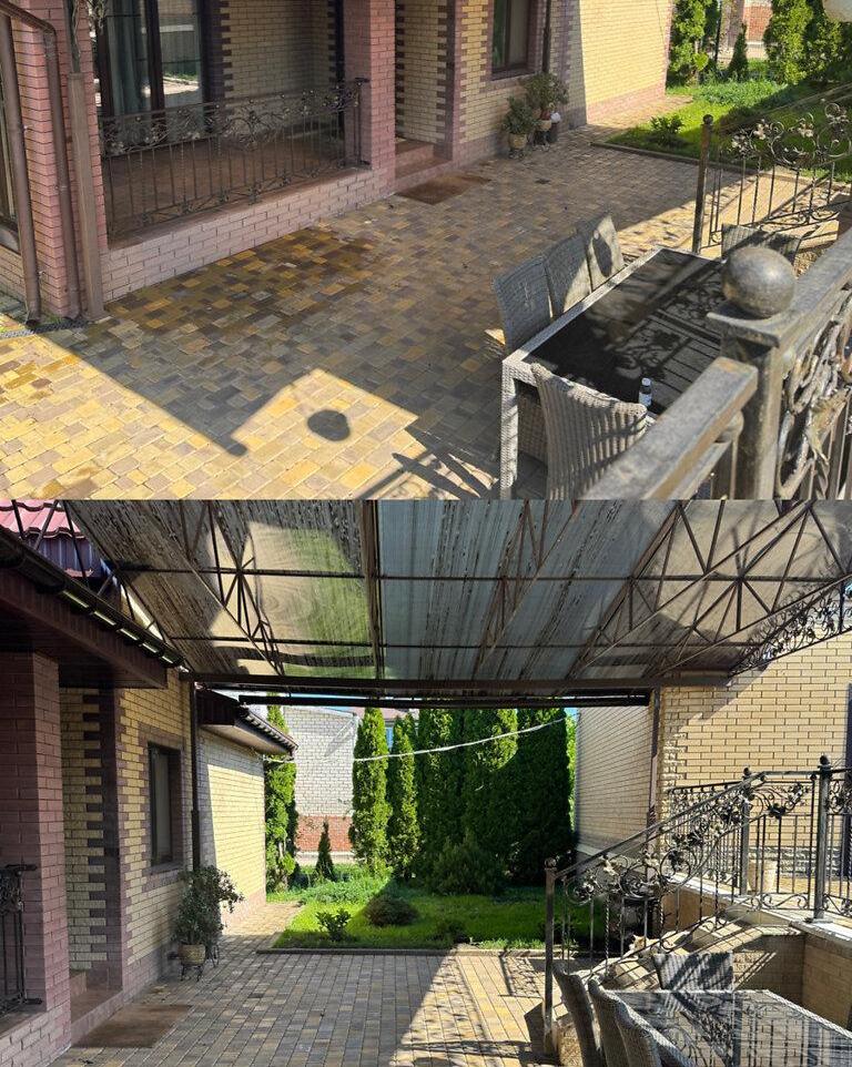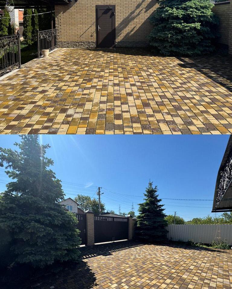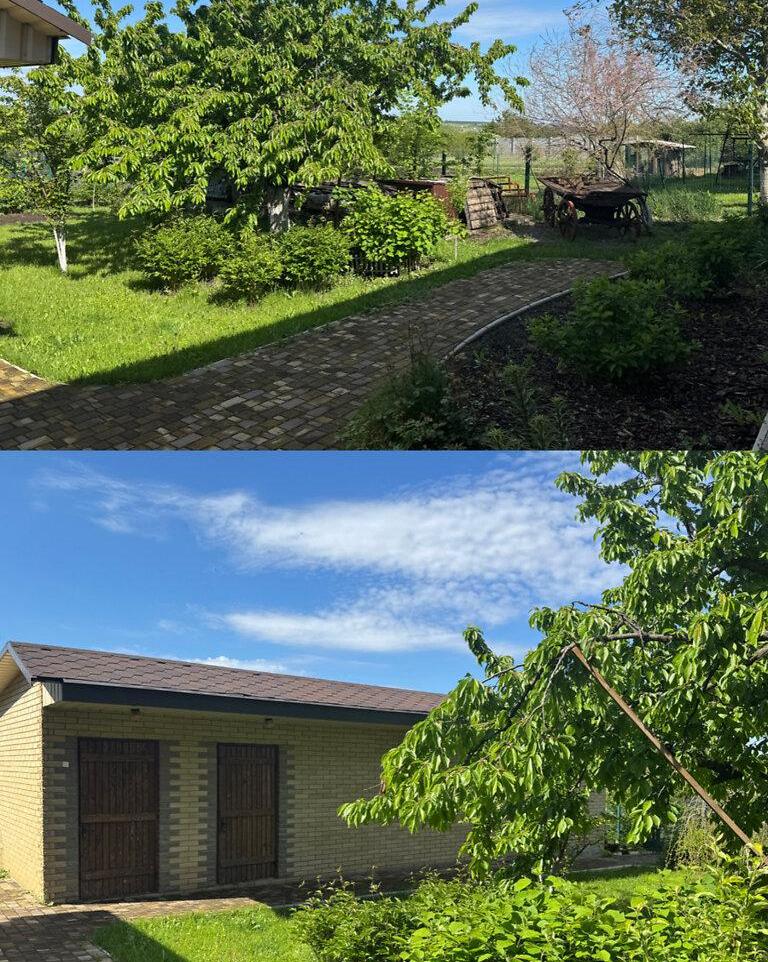 Великий гараж на дві машини, доглянута територія з ландшафтним дизайном та тротуарною плиткою навколо будинку.