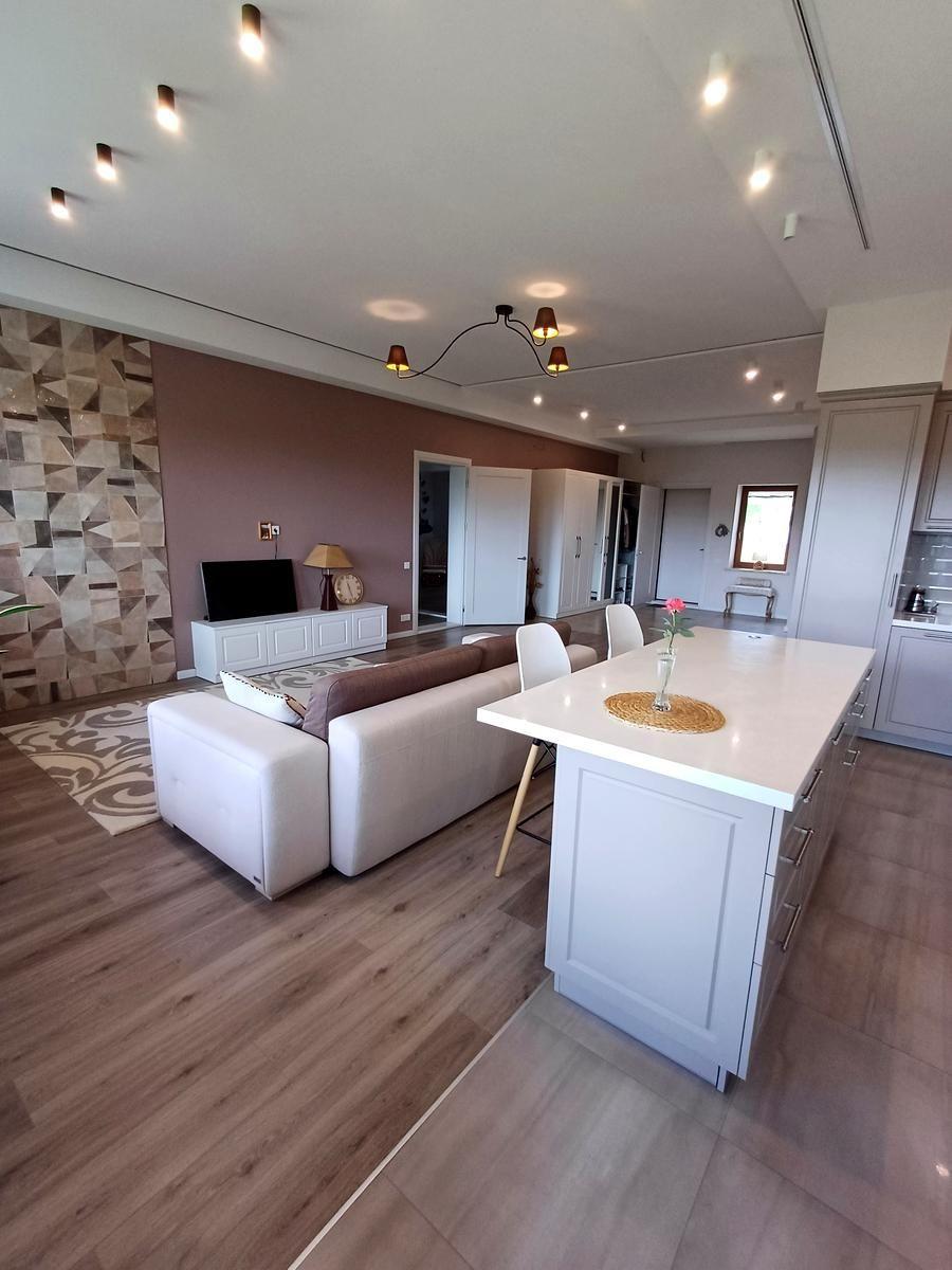 1 этаж: кухня – 13,1 м²., гостиная – 27 м²., 3 комнаты, 2 сан.узла, гардеробная.