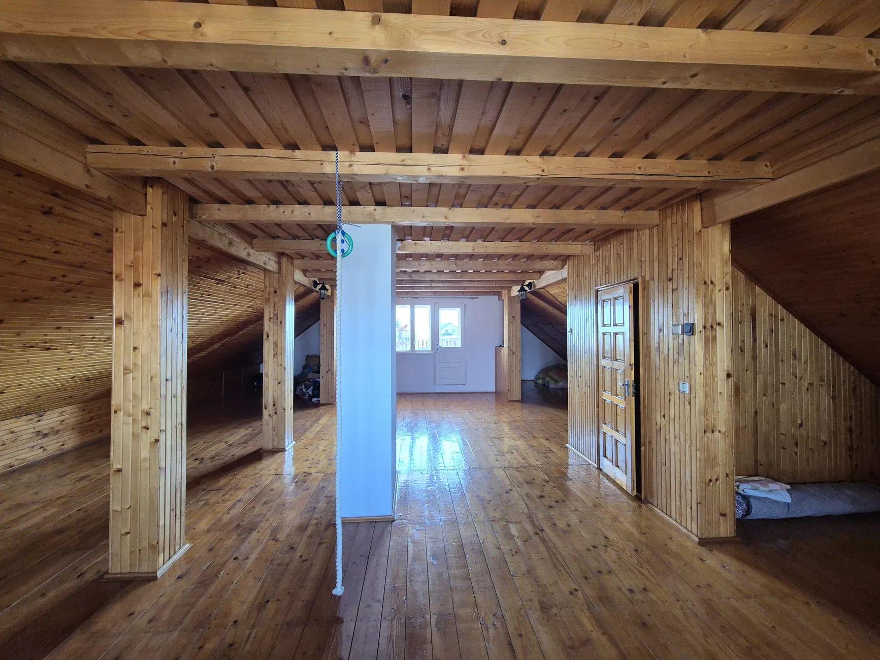 Третий этаж (чердак) весь обит натуральным деревом. Отопительная система обогревает два этажа. Не включено общее отопление на третьем этаже, то есть экономнее получается по затратам на отопление. Наружные стены основного дома очень широки, сделаны из кирпича. Деревянная с ковкой лестница на второй и третий этажи.