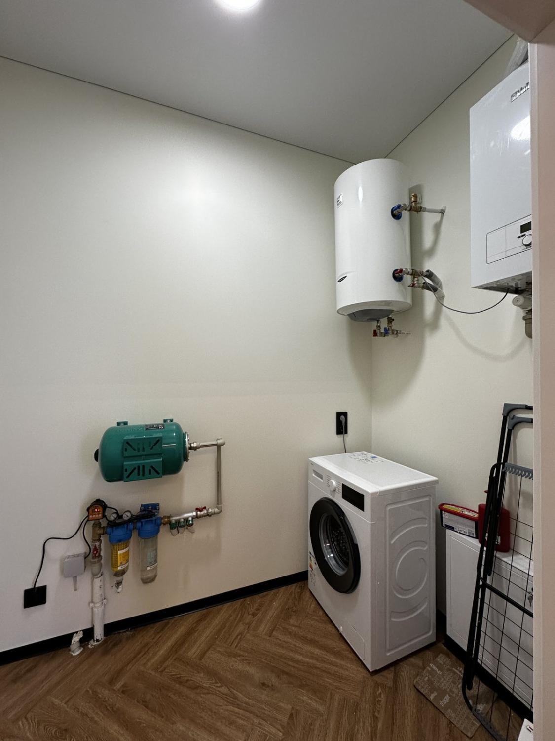 Техническое помещение-бойлер, котел, насос, разводка на теплый пол и стиральная машина.