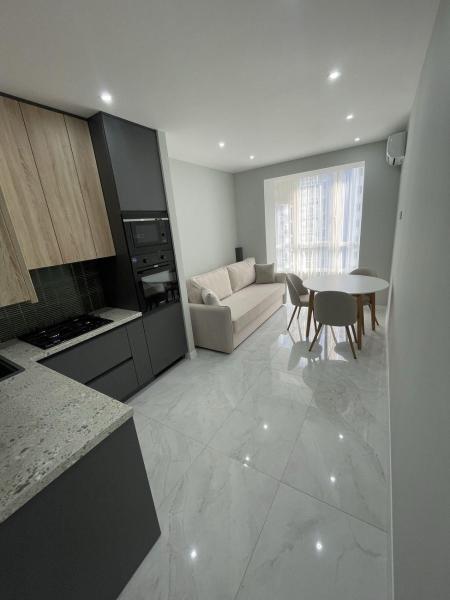 Продається квартира в новому житловому комплексі "Затишний" комфорт-класу зі стильною авторським дизайном. 1 кімната, 44.20 кв. м, кухня 18.50 кв. м.