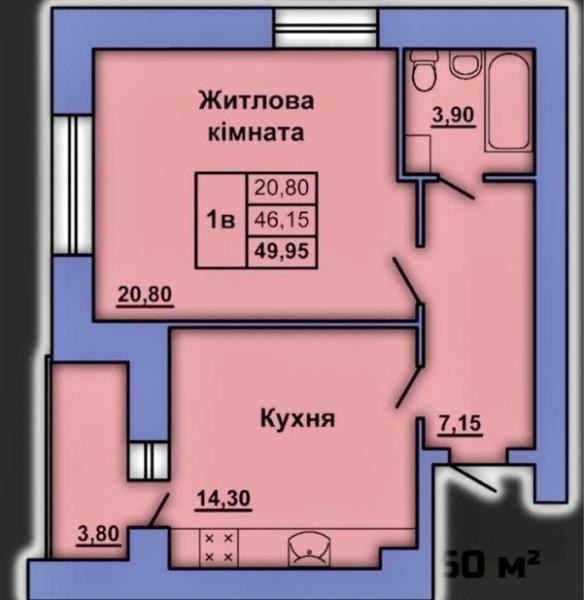 Загальна площа 41.2 м².Штукатурка і чорнова стяжка.