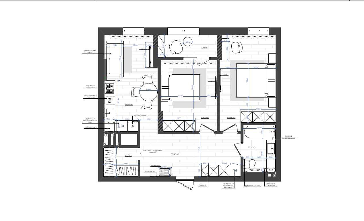 Квартира площею 70 кв.м, 2 ізольовані кімнати, кухня вітальня, гардеробна.