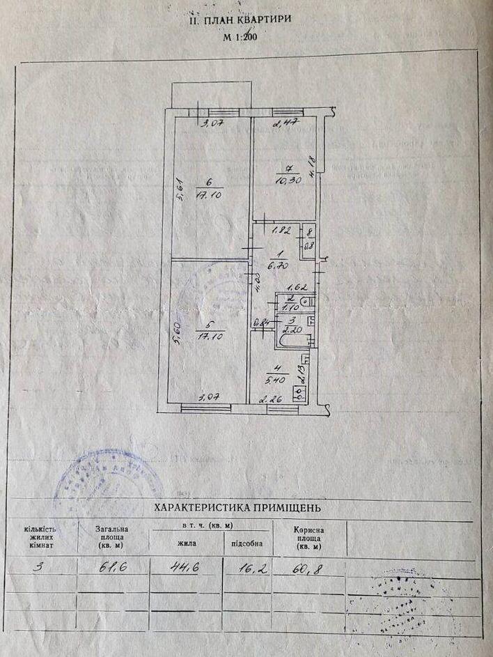 Поверх – 2/5, заг. площа – 61,6 м²., житлова – 44,6 м²., кімнати – 17,1 + 17,2 + 10,3 м²., кухня – 5,4 м²., квадратний хол, всі кімнати роздільні, роздільний сан. вузол.