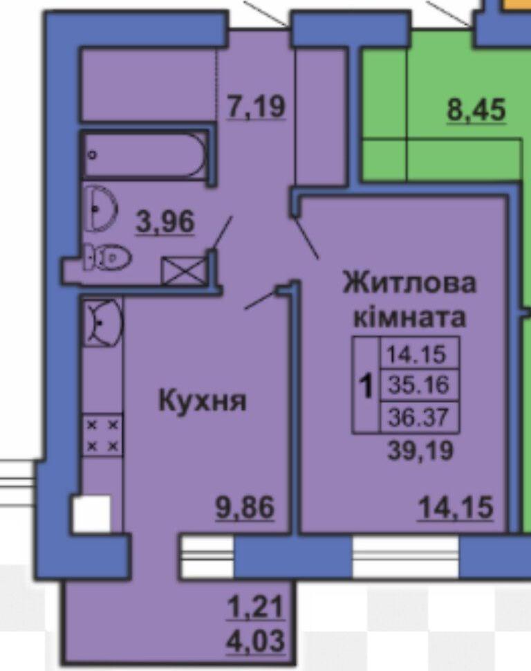 1 кімн. · 7/10 пов. · 36/14/9.80 м²