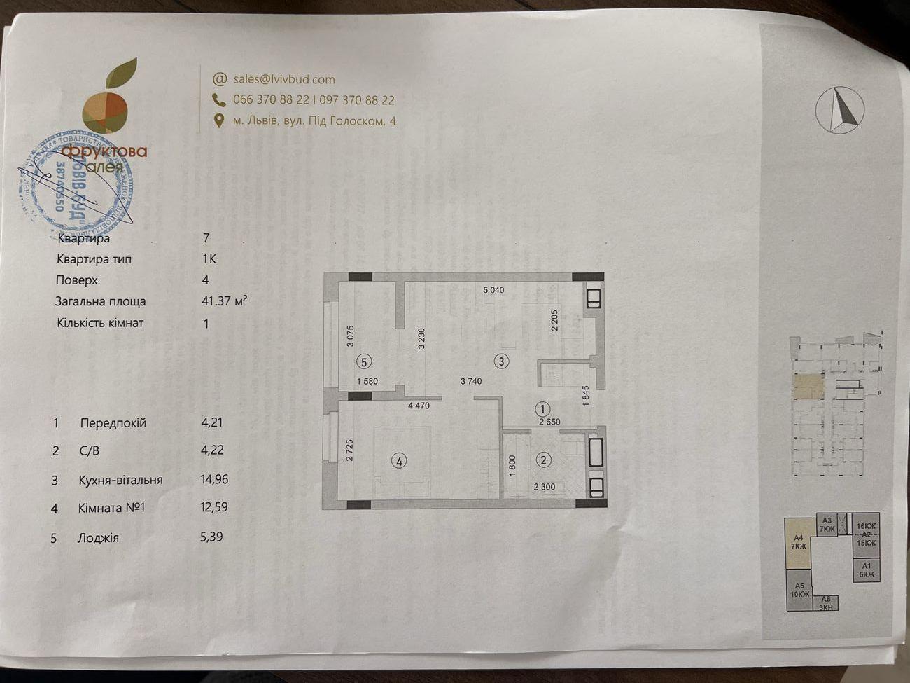 Квартира розташована на 4 поверсі, загальна площа 41,37 м². Просторе планування — кухня-вітальня, окрема кімната, санвузол та велика лоджія з панорамними вікнами.
