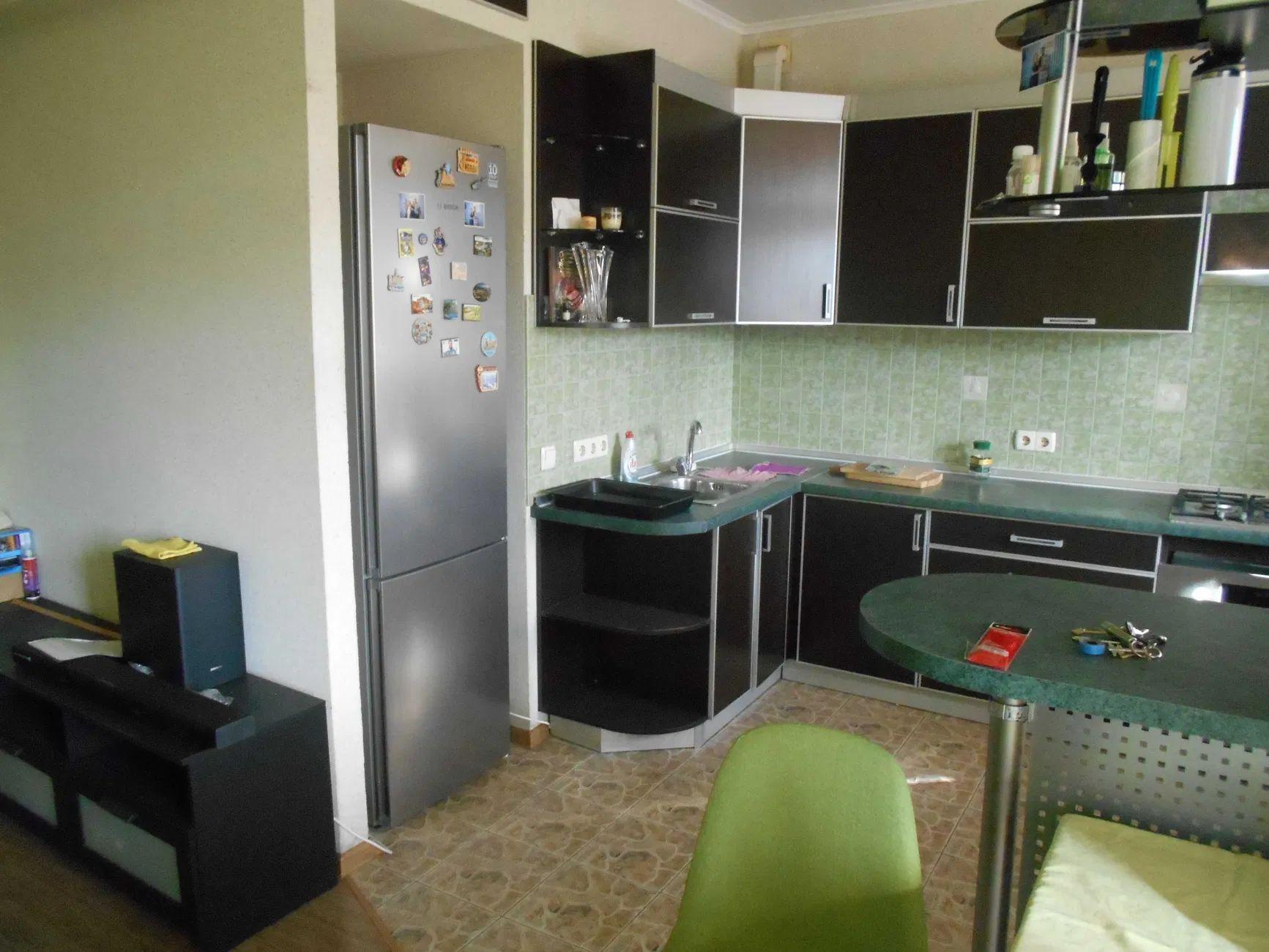 Євроремонт, виконане перепланування. Формат: кухня-вітальня – 22 м². та дві кімнати, великий засклений балкон.