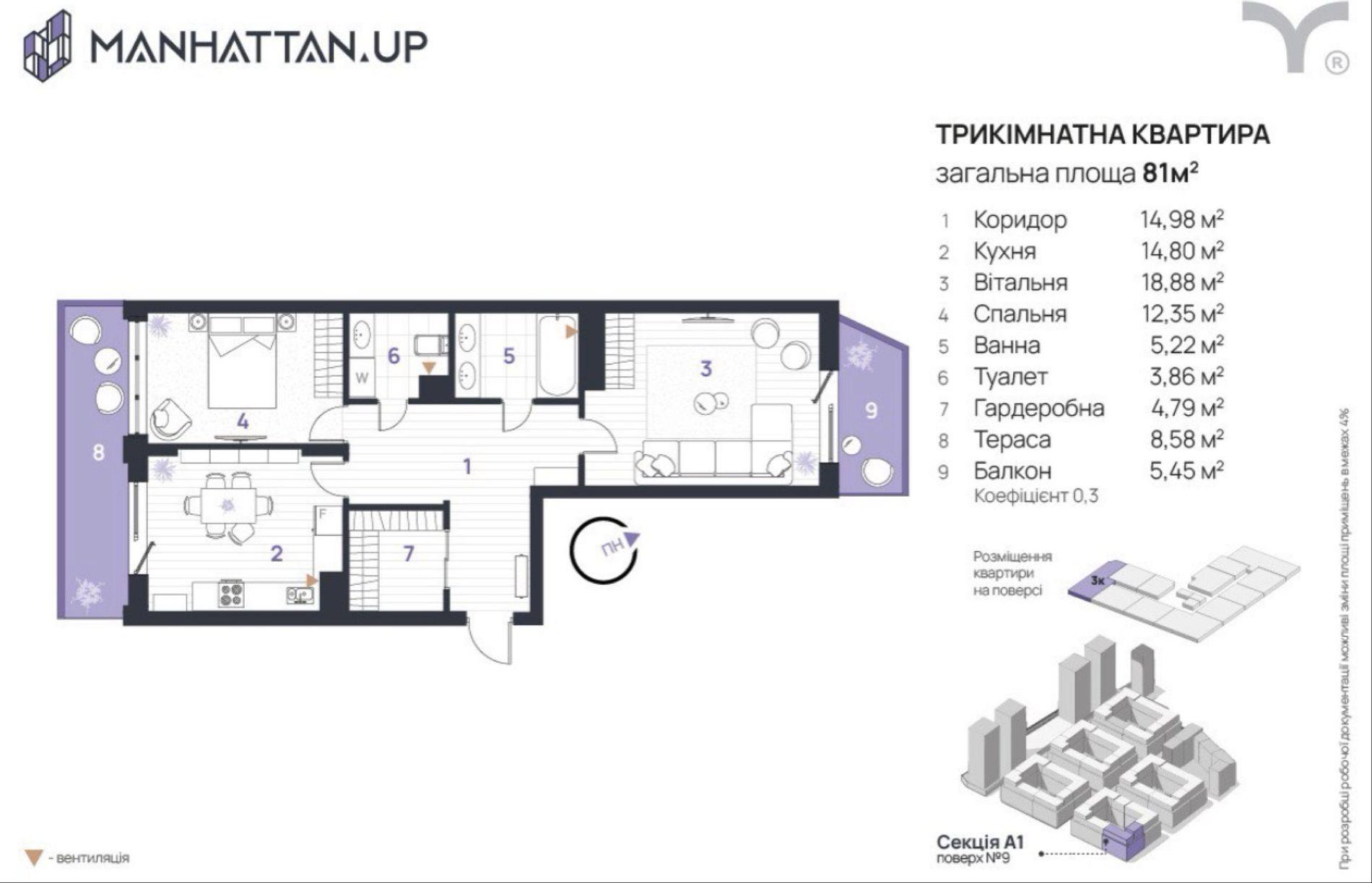3 кімн. · 9/13 пов. · 76 м²