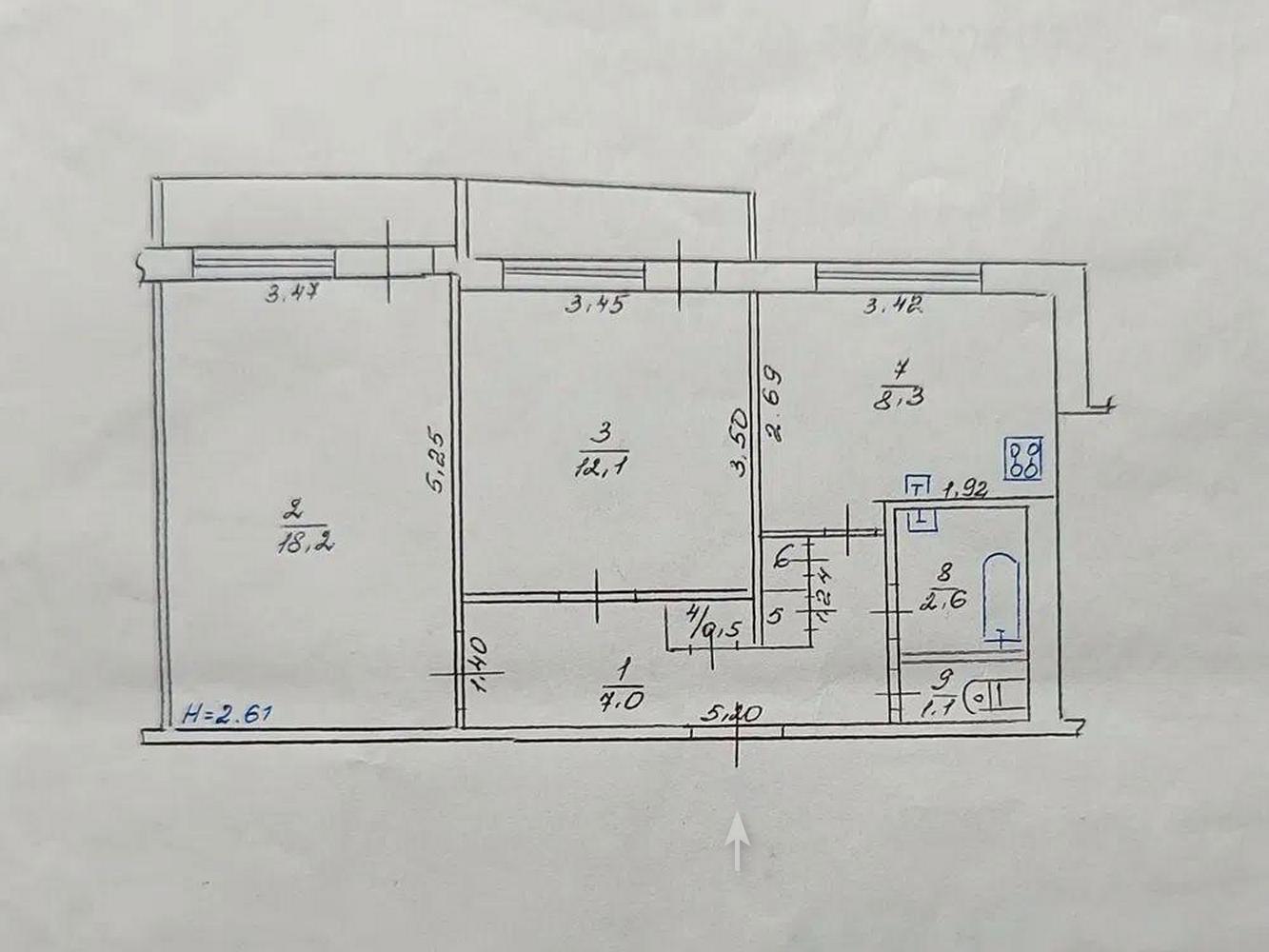Поверх – 11/16, заг. площа – 52,3 м²., житлова – 30,3 м²., кухня – 8,3 м²., окремі кімнати, два балкони.