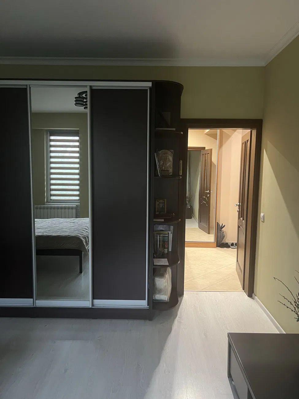 Три окремі кімнати, великий санвузол, декілька гардеробних приміщень, кухня, балкон