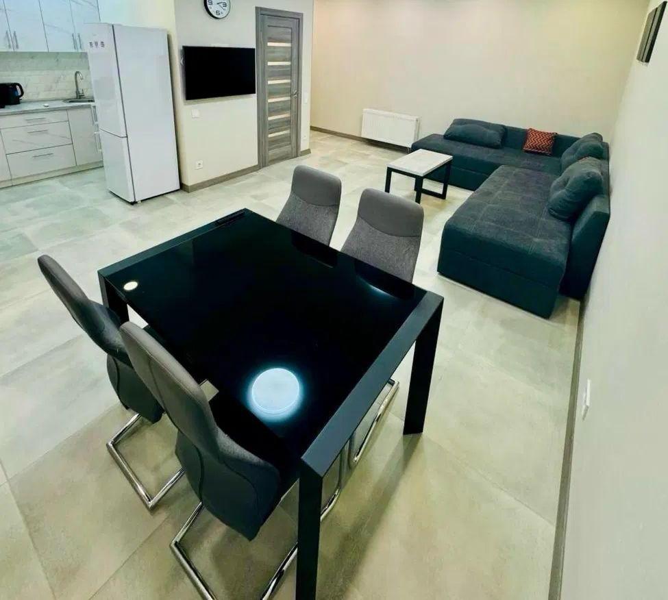 Формат: кухня-вітальня, дві спальні (кожна зі своєю панорамною лоджією), суміщений санвузол з душовою кабіною.