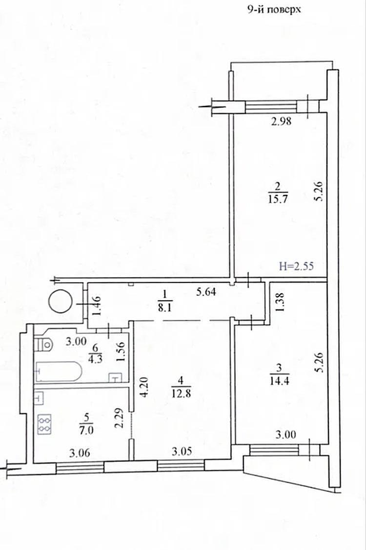 3 кімн. · 9/9 пов. · 64/43/6 м²
