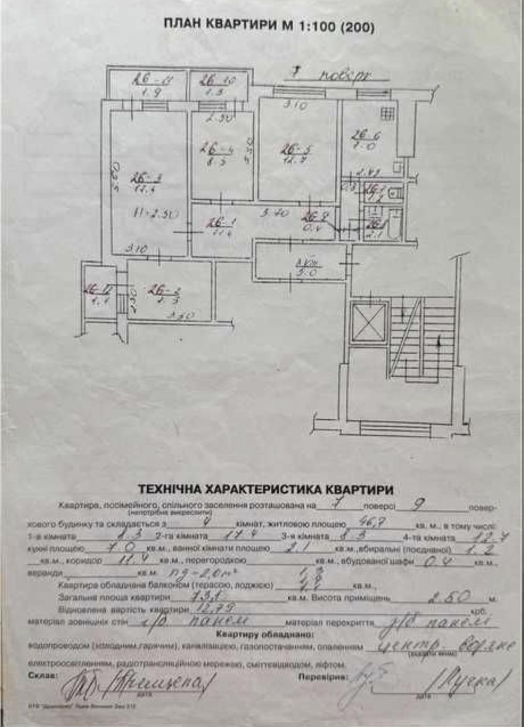 Загальна площа 73,1 м2, житлова 46,7 м2, кухня 7м2. Квартира розташована на сьомому поверсі дев'ятиповерхового будинку. Під'їзд в чистому та сухому стані з кодовим замком. Вмонтований новий ліфт. Квартира простора та світла в хорошому житловому стані з усіма меблями та побутовою технікою для комфортного проживання. Три ізольовані та одна прохідна кімната, усі чотири правильної форми. Вікна трьох кімнат виходять на південну сторону, а четвертої кімнати на східну. Для побутового комфорту три засклених балкони. Просторий коридор з великою шафою-купе для зберігання особистих речей. Два роздільних санвузли. Додатково у вартість входить підвал та горище без доступу сторонніх. Можливість паркування автомобіля в межах прибудинкової території. Тихий та спокійний внутрішній двір. Бонусом до квартири належить підвал та відведене місце під ключ на горищі.