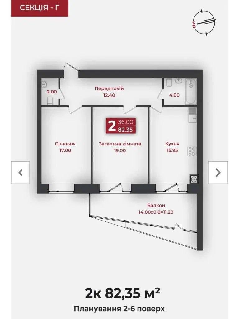 2 кімн. · 5/11 пов. · 82/36/16 м²