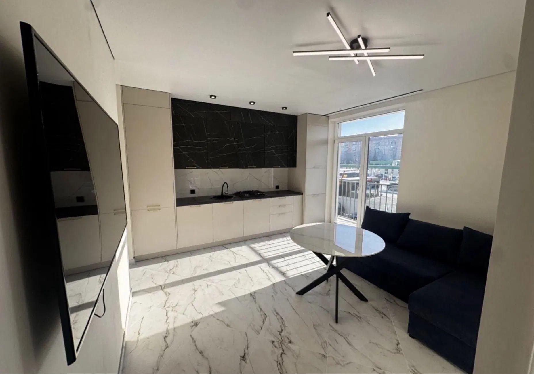 Кухня студія укомплектована меблями та технікою.