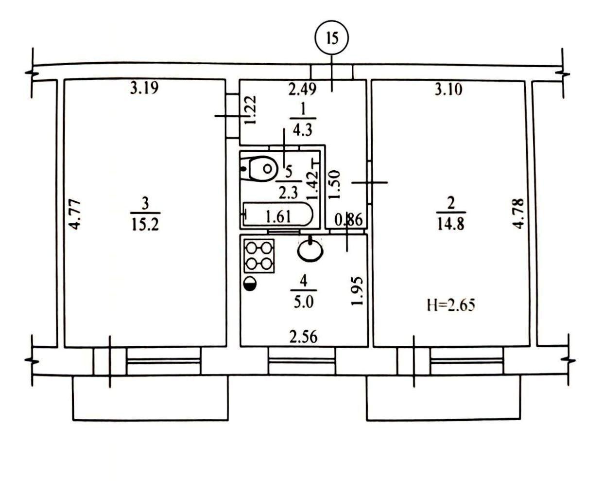 Кімнати роздільні, кожна кімната має балкон , а між кімнатами розташована кухня та суміжний санвузол. Квартира в поганому стані. В квартирі 2 кімнати, висота стелі 2.5 метра. Загальний стан квартири - Без ремонту.