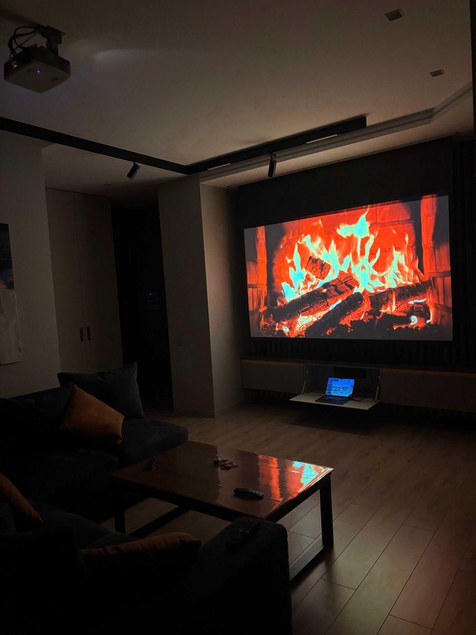 Вікна на обидві сторони будинку Вітальня з телевізором та проектором, моторизований екран проектору вмонтований в стелі.