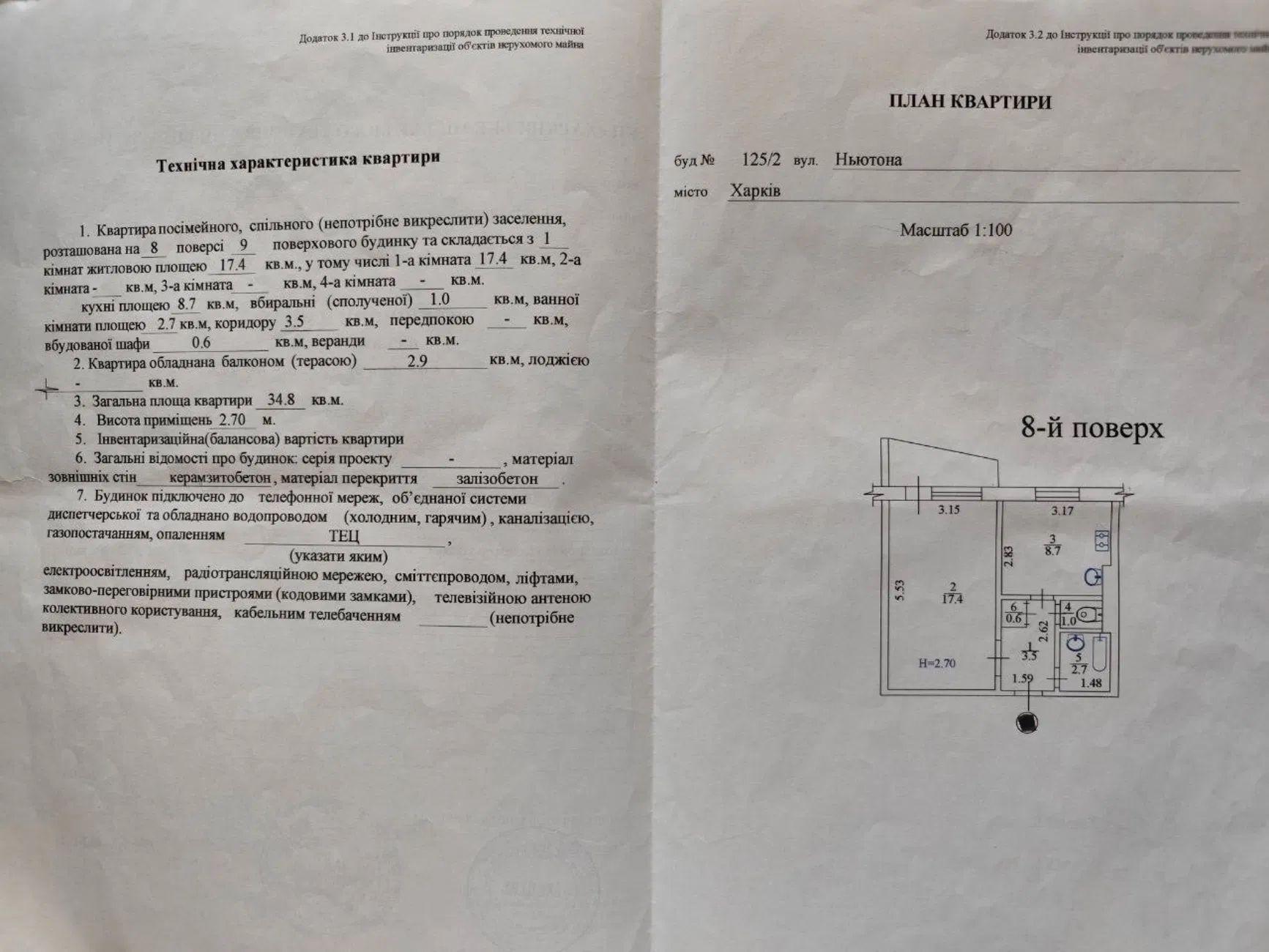 8/9 поверх, загальна площа 35 м2, кухня 8,7 м2. Кімната 17,9 м2. Плита газова. Сан.вузол роздільний. Подача тепла верхня.