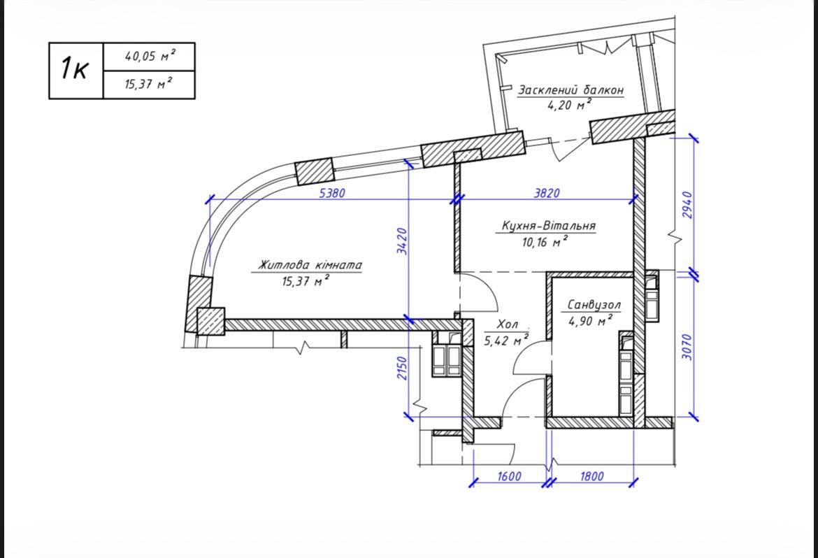 1 кімн. · 2/11 пов. · 40.05/15.37/10.16 м²