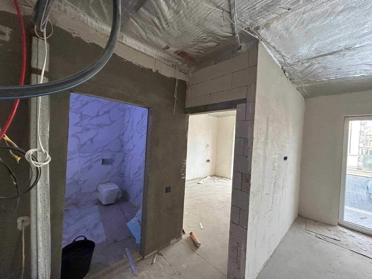 Всередині квартири розведена сантехніка, встановлено трап, інсталяція з унітазом, плитка у ванній кімнаті,тепла підлога по всій квартирі, чистова стяжка, встановлені міжкімнатні перестінки, стіни поштукатурені, заведений силовий кабель, встановлені вхідні двері, підключені лічильники на світло та воду, електрична розводка по всій квартирі, встановлено котел для опалення + бойлер.
