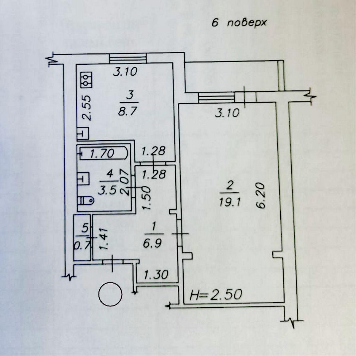 Поверх – 6/9, заг. площа – 42 м²., кухня – 9 м².