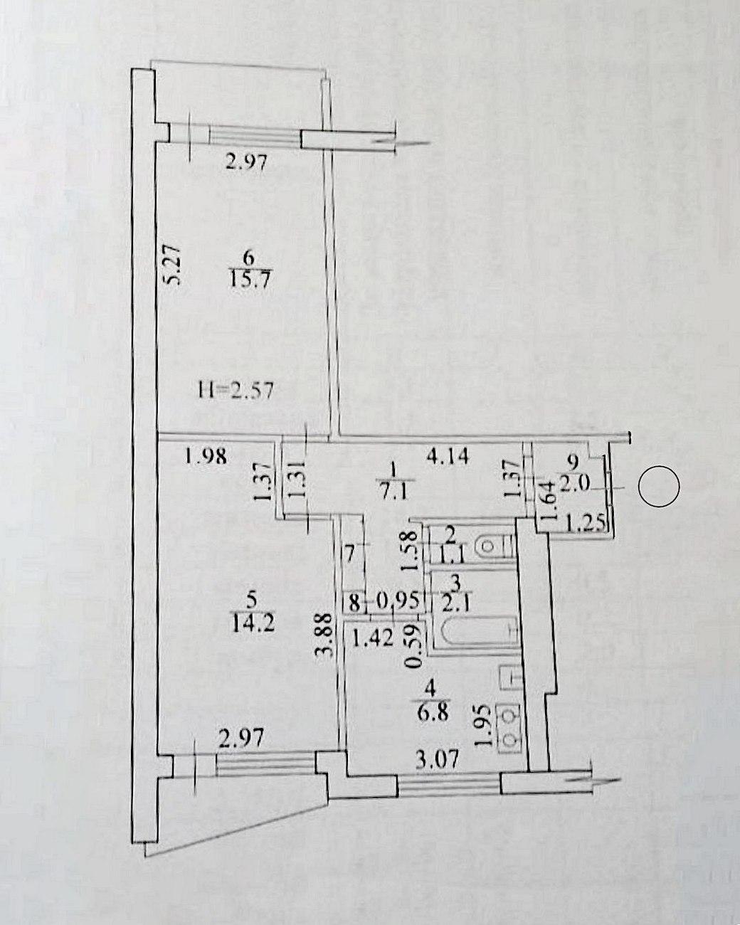 Поверх – 1/9, заг. площа – 51,5 м²., житлова – 30 м²., кухня – 7 м²., два балкони.
