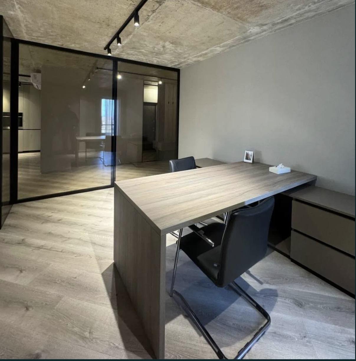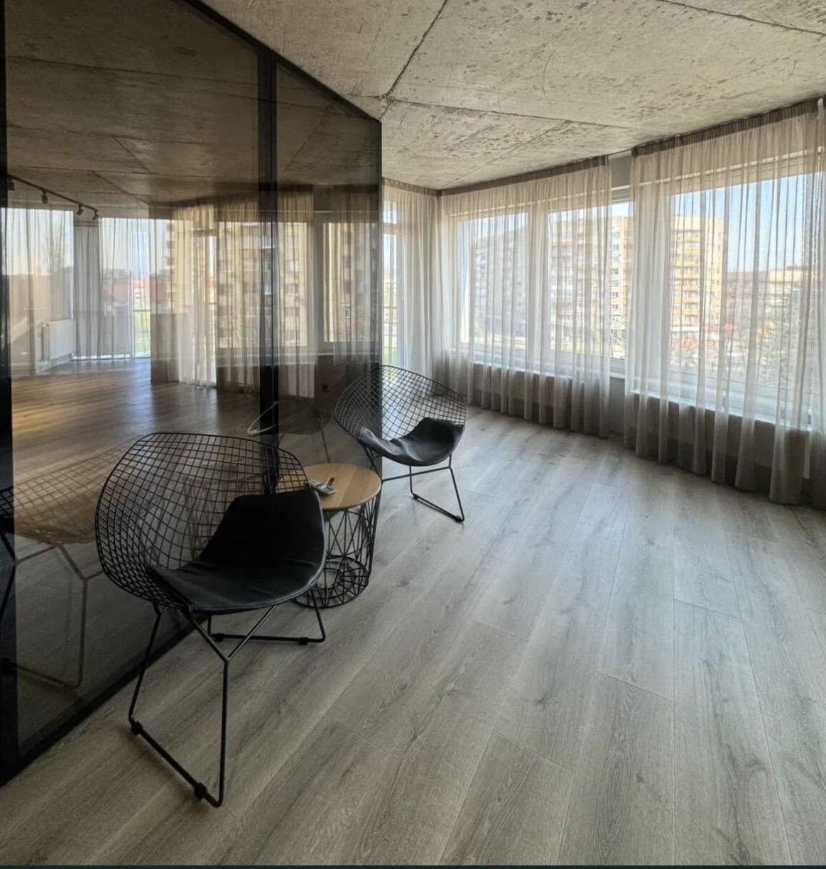 Планування: кухня з великою вітальнею, 2 окремі кімнати з скляними перегородками, одна з кімнат має свою гардеробну кімнату та балкон у внутрішній двір, ванна кімната та балкон тераса.