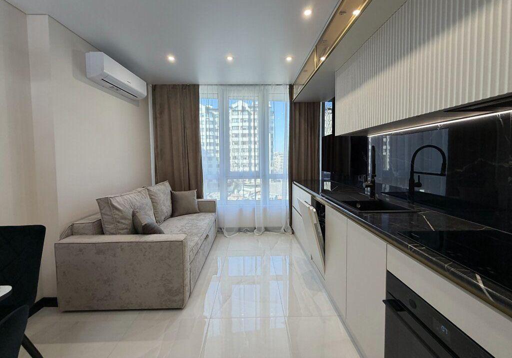 Простора кухня-вітальня з диваном та ТВ-зоною, 2 окремі кімнати, великий санвузол, гардероб та вбудовані шафи.