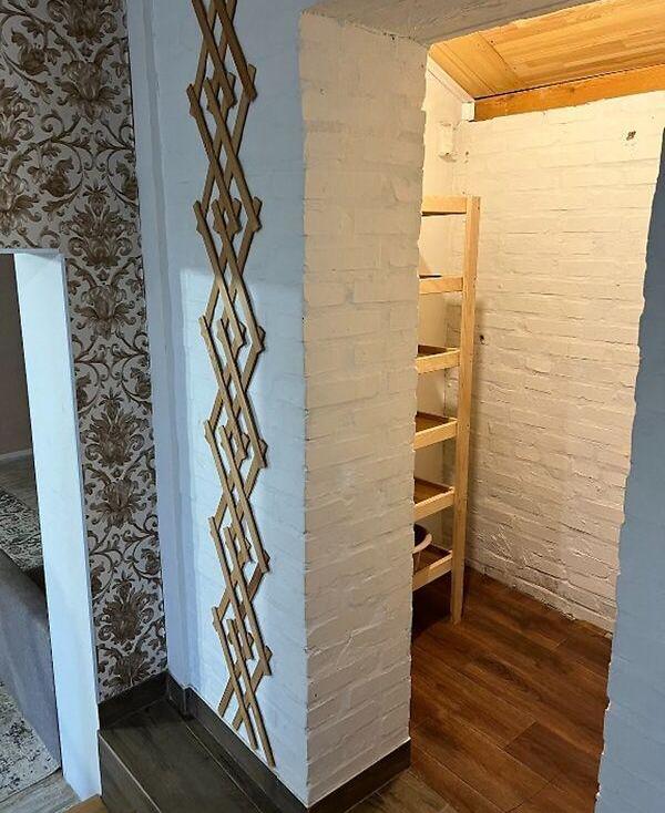 У будинку на першому поверсі вітальня, кухня, санвузол ,гардеробна, на мансардному поверсі 2 кімнати .