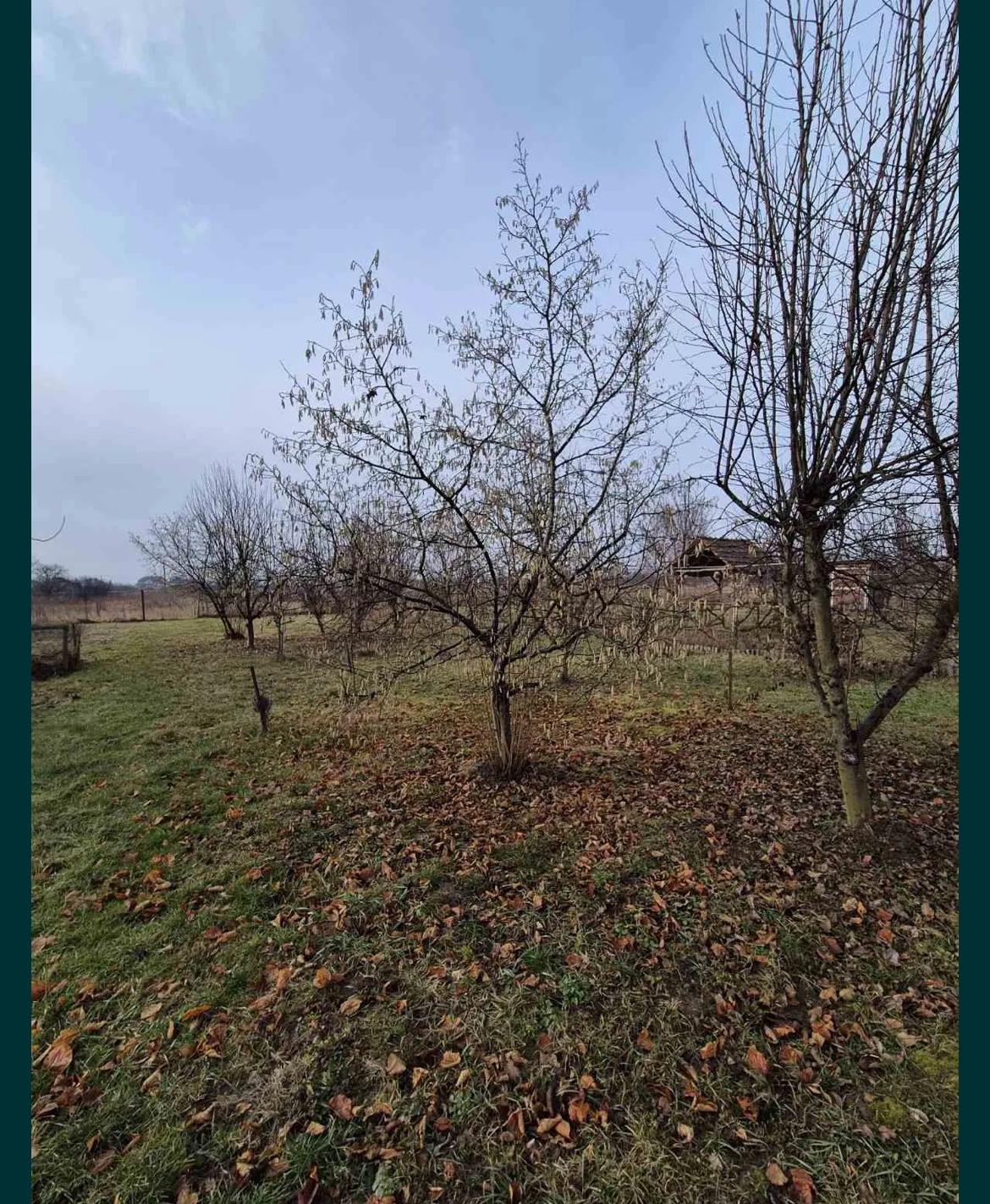 Біля дому гараж з бетонованою смотровою ямою і великий фруктовий сад.